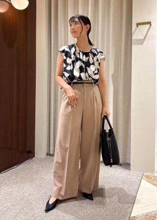 襟ぐりからタックギャザーが華やかなブラウス。裾をインでもアウトでも決まる着丈感。サイドスリットなので、前だけタックインでも可能。やや肩にかかる袖丈も嬉しいポイント。同素材でパンツとスカートがございます。