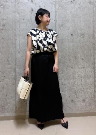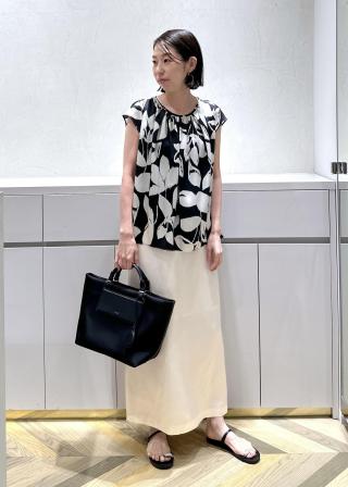 スベスベサラッと軽く、シワになりにくい。ゆとりのあるフレンチスリーブのブラウス。首周りも詰まってなくて鎖骨が少し見えるくらいで丁度いい。ヒップも隠れる丈で、サイドにスリットが入っていてインでもアウトでも楽しめます。