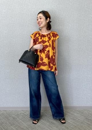 同柄のボトム(スカート/パンツ)と合わせたセットアップ風の着こなしが可能。単品使いで、デニムやキレイめボトムとも好相性。
