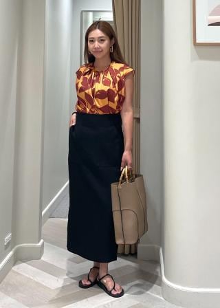 身幅に程よいゆとりがあるので、ボディラインを拾わずにお召し頂けます。ヒップラインに少しかかるくらいの着丈でした。
