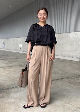 首回りのタックギャザーが華やかなブラウス。インでもアウトでも決まる着丈・サイドスリットなので、前だけタックインも素敵です。波を打つような落ち感でストレスなく着用でき、しっかり二の腕もカバーできます。