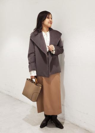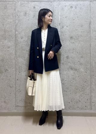同素材のプリーツスカート(品番:GGC35100)と合わせれば、洗練されたセットアップスタイルに。