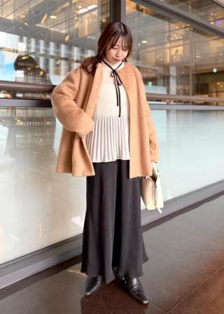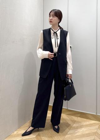 人気のプリーツブラウスを少しアップデートしたデザインです。フェミニンな要素のあるブラウスなので、パンツとのコーディネートがおすすめです。首元のリボンはしっかり結んでも良いですし、結ばずに垂らして抜け感を出すのもおすすめです。