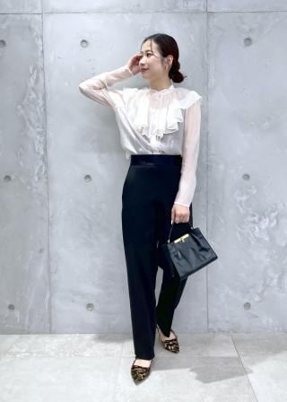 ケープをあしらったような衿元のデザインブラウスは顔回りが華やかな印象になります。甘くなりすぎないようにギャザーの溜まる位置や衿の大きさ、角度までこだわりました。ボディはすっきりとしたシルエットなのでボトムにタックインしてもすっきり。袖山にオーガンジーの裄綿を入れる事で肩にポイントができ、長めのレッグオブマトンスリーブのシルエットで肩から腕が細長く見える効果があります。