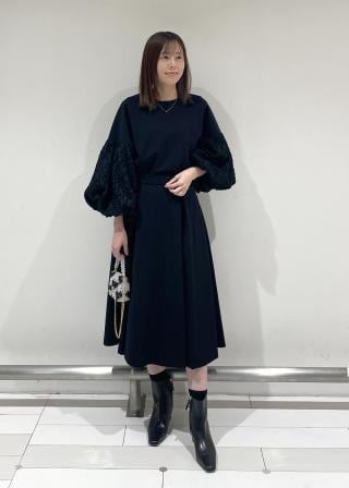 身頃はすっきりとしたミニマルなデザインに対し、袖には繊細な凹凸感のあるジャカード生地を使用し、華やかさと奥行きのあるシルエットを演出します。
