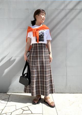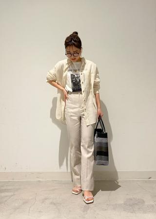 シンプルになり過ぎないよう、プリントTシャツを選び胸元から見える柄をポイントにしました。