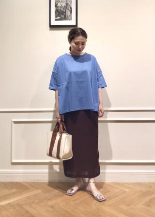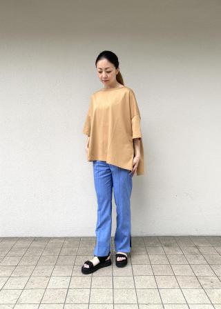 ポンチョのようなワイドボディのTシャツ。中心のステッチ接ぎや深めのサイドスリットがポイントになっています。