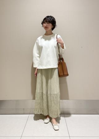 シンプルなデザインのトップスなので、ボトムはスカート・パンツ問わず合わせやすいアイテムです。