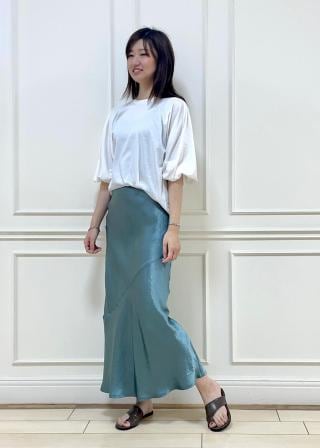 ボトムにもインしやすく裾はすっきりとしたデザインなので、ハイウエストパンツやスカートとのスタイリングがおススメです。デニムでカジュアルアップも〇
