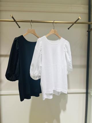 身頃はカットソー、袖はスケ感のあるシフォン素材のコンビカットソー。襟ぐりと袖口の始末をニットリンキングすることで、高級感とこなれ感を表現。カットソー素材は白でも透けにくい肉感を使用しています。袖はシアー素材で、トレンド感のあるギャザーデザイン。1枚できまるデザインカットソーに仕上げています。
