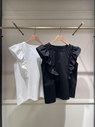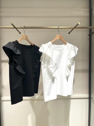 1枚で華やかなフリルデザイン。布帛のフリルはハリがあるので肩先まで掛かり二の腕をカバー。すっきりとしたサイズ感の身頃で、フリルはウエストライン下まででカットしているので、ボトムにタックインしてももたつきません。