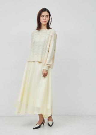 ワイドシルエットプルオーバーの前身頃をロペオリジナルモノグラムプリントを施した生地をリンキングしてモダンに仕立てました。ラインで描かれた程よい存在感のモノグラムがポイント。衿は華奢に仕上げて女性らしく。着ると脇が垂れて豊かなドレープが生まれます。袖はニットで細めにしているので上からコートを着てももたつきません。