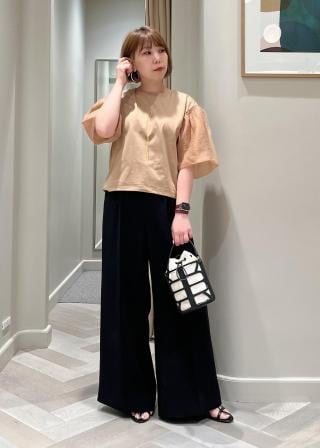 ミニマルなボディに布帛の袖をダイナミックに組み合あせたデザインカットソー。ボディは立体的なフォルムが出るようにパターンを工夫しています。ドロップショルダーに付いた袖はやや長めの5分袖で、ギャザーバルーンスリーブが華やかな印象です。後ろ衿のボタンもポイントになっています。