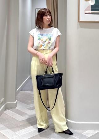 フロントにプリントがあるのでジャケットのインにもしやすく、スラックスのようなマスキュリンなパンツに前だけタックインして、フラットサンダルというい着こなしも似合います。