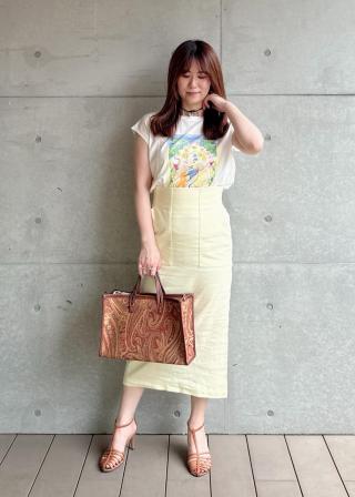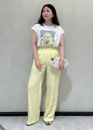 フロントにプリントがあるのでジャケットのインにもしやすく、スラックスのようなマスキュリンなパンツに前だけタックインして、フラットサンダルというい着こなしも似合います。
