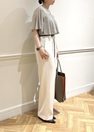 ハイウエストのボトムに裾をタックインしてケープ見えトップスとして着用していただくのがおすすめです。