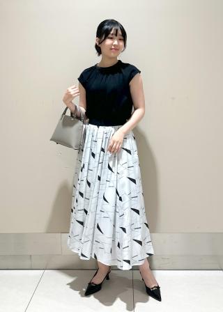ネック回りにギャザーとタックを入れることで、ボディのシルエットはゆったりと肌離れさせ、フレンチスリーブで気になる二の腕ラインをカバーしています。