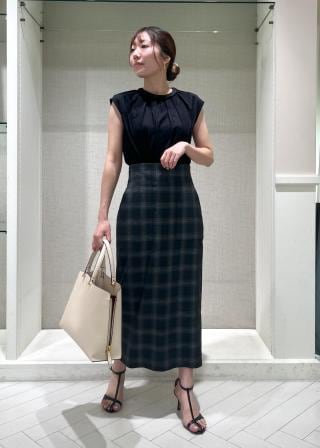 ネックのシルキーなサテン切り替えで、同色使いですが、素材でのコントラストをつけてエレガントな印象に仕上げました。