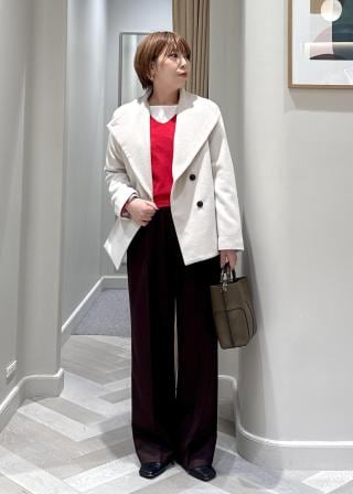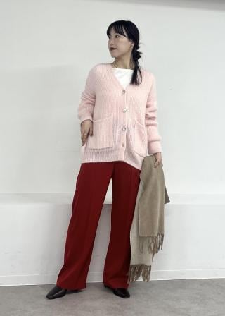 ツイード風ニットジャケットのインナーとして合わせると、程よくきれいめな印象に。首元がすっきり見える衿ぐりラインが羽織りスタイルにも好バランス。ボトムにはイージーパンツを合わせ、リラックス感のあるこなれたシルエットに。程よく力の抜けた雰囲気ながら、品よくまとまるスタイリングはオンオフ問わず活躍する大人のデイリーカジュアルにぴったりです。