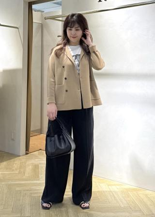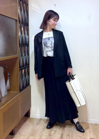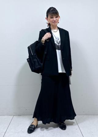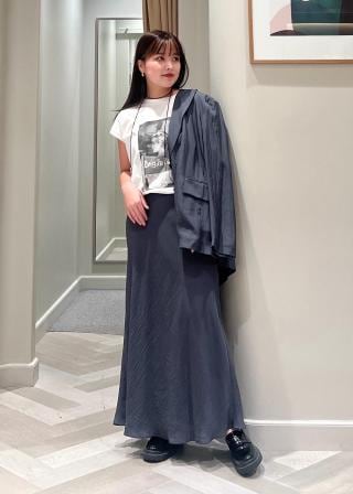フロントにプリントがあるのでジャケットのインにも最適。スラックスのようなマスキュリンなパンツに前だけタックインし、フラットサンダルを合わせるスタイリングもおすすめです。