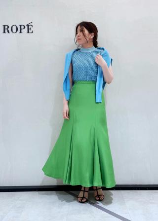 この時期のリアルなコーディネートにしたかったので、柄が華やかなノースリニットにジャケットを肩がけしてみました♪