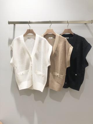 夏でもエレガンスにパール釦をあしらったフレンチスリーブのベストはプルオーバー感覚で着てもらいたい夏のポイントアイテム。太めの前立て、袖のリブをアクセントにしたこの夏一枚は取っておきたい万能ベストです。
