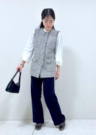 キチンとしたスタイルからカジュアルまで幅広く使えて、お出かけシーンにおすすめのツイードジレです。