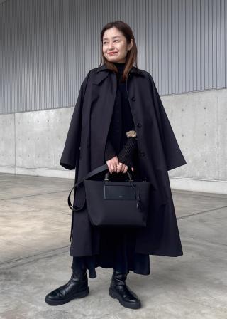 長めの着丈ですが、ウエストがすこしシェイプして見えるので、ウエストにくびれがない私でも腰位置が高く脚長効果ありでした!フロントボタンを開けて着てもすっきりとロペらしいエレガントな着こなしになります〇