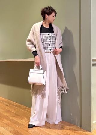 細身のトップスの上だと落ちてきてしまいますが、これからの時期のシャツやニットの厚さで調整して着て頂けると思います!色々なレイヤードを楽しめます!