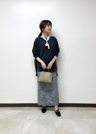 スクエアネックですっきりとした首元のワンピースなのでボリュームが出過ぎないようにスカーフを巻きました。