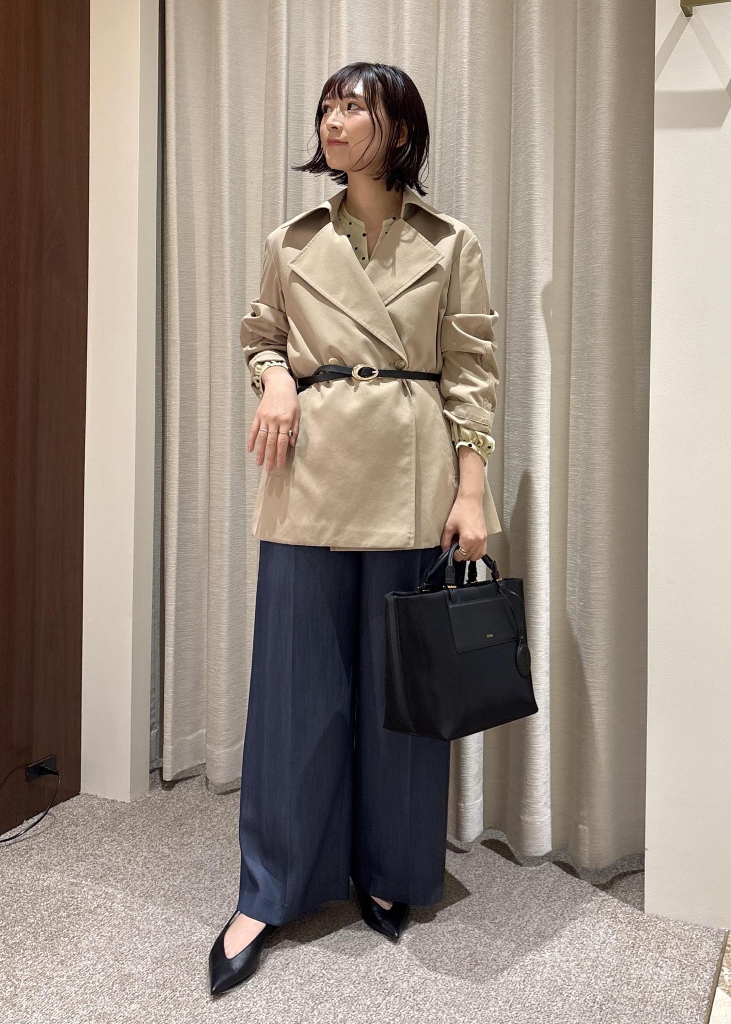 落ち着いた色味なのでゴールドのアクセと赤色のバックで華やかにしてみました!足元はサイドゴアブーツでカジュアルダウンに♪