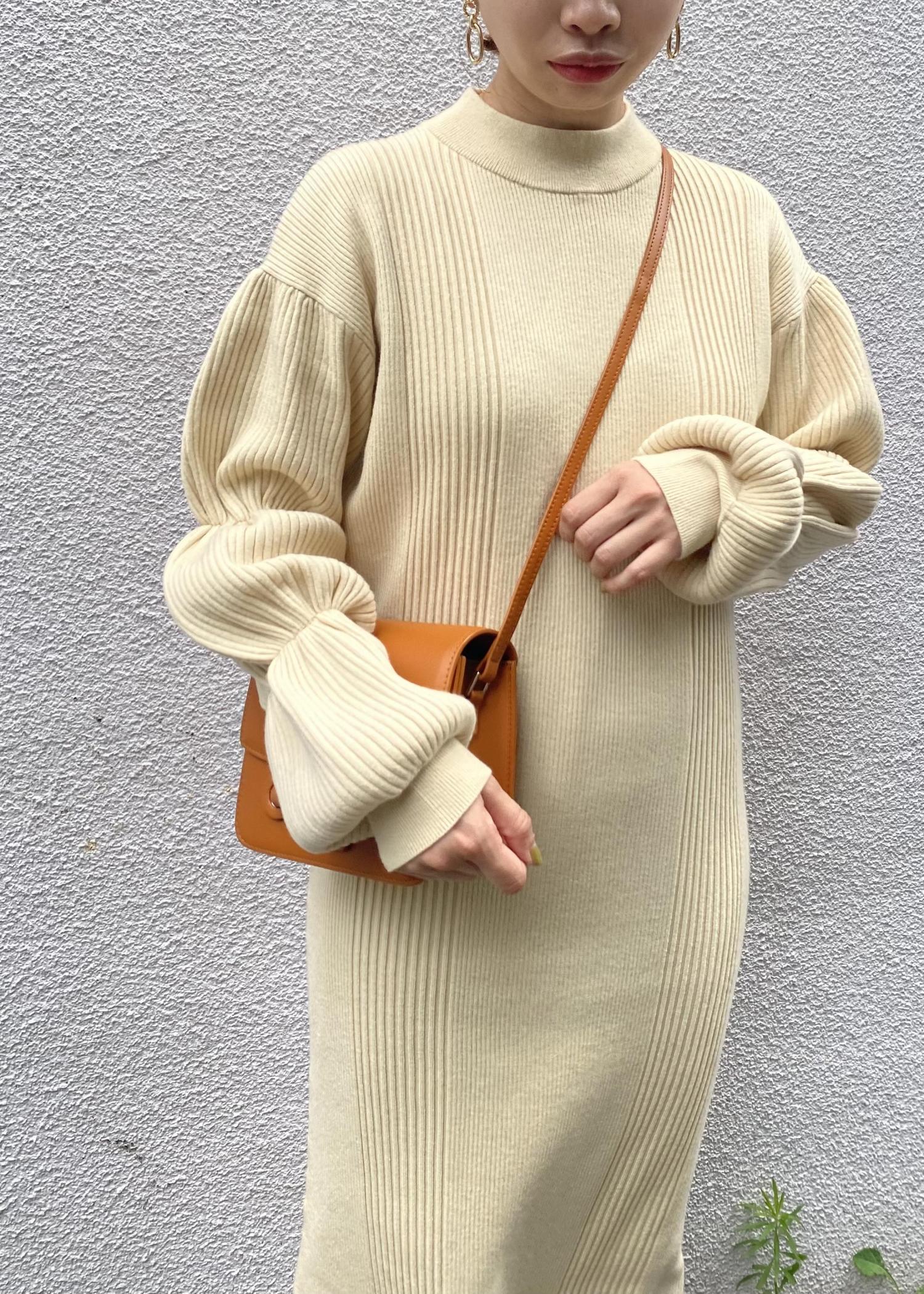 袖のパフスリーブデザインが目を惹くフェミニンなニットワンピに