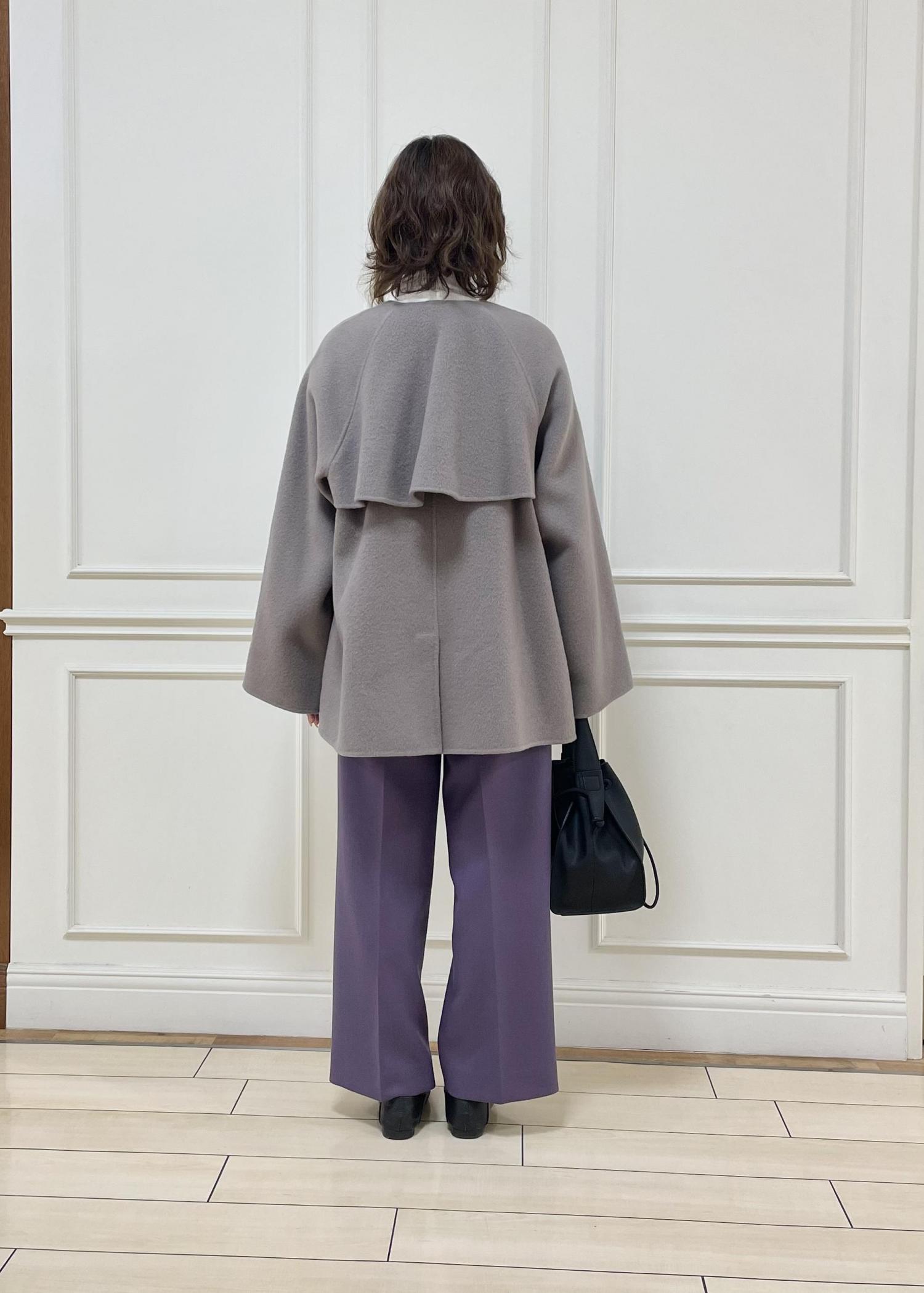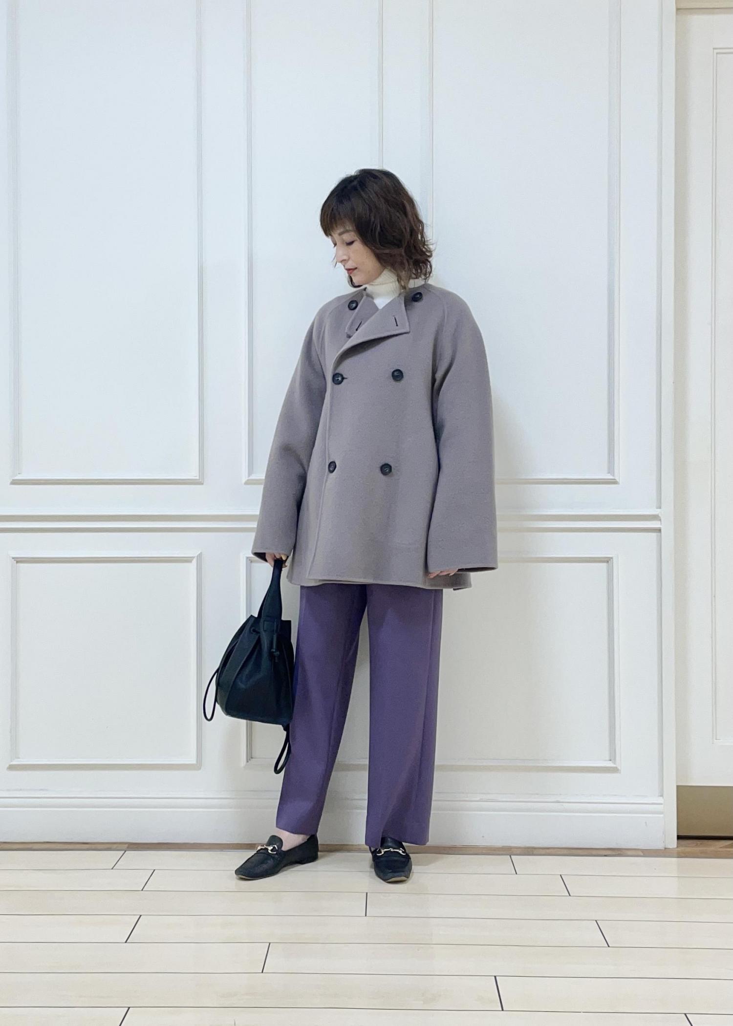 ブラウンのショートコートに、キレイなパープルカラーのパンツを合わせました。