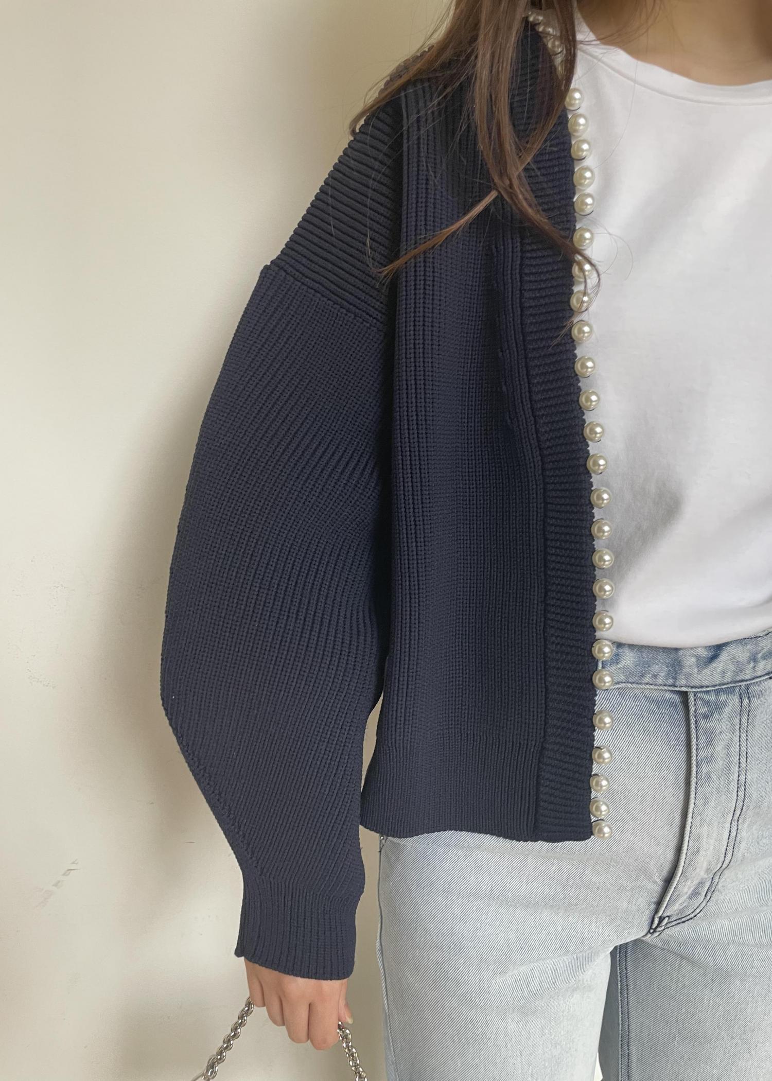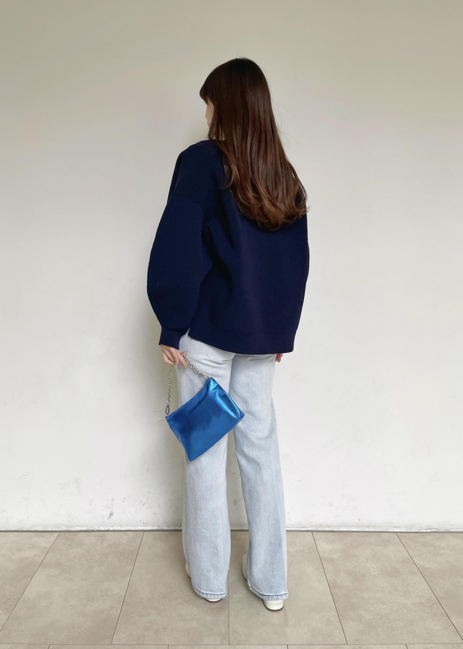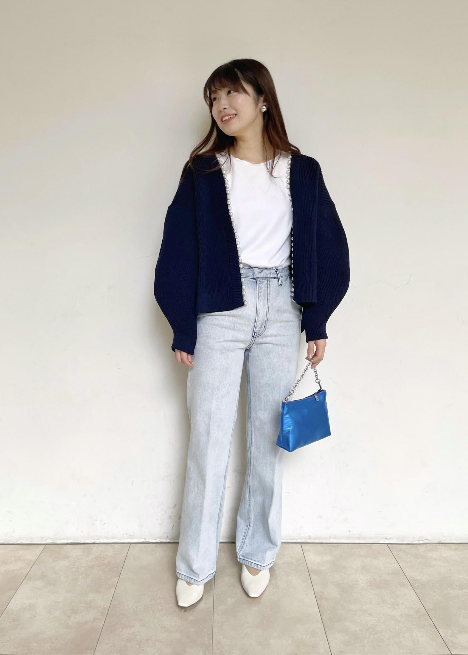 パールが映えるネイビーのカーディガンと、存在感のあるメタリックのバックと合わせて、春のキーカラーである"ブルー"のワントーンコーデにしてみました!