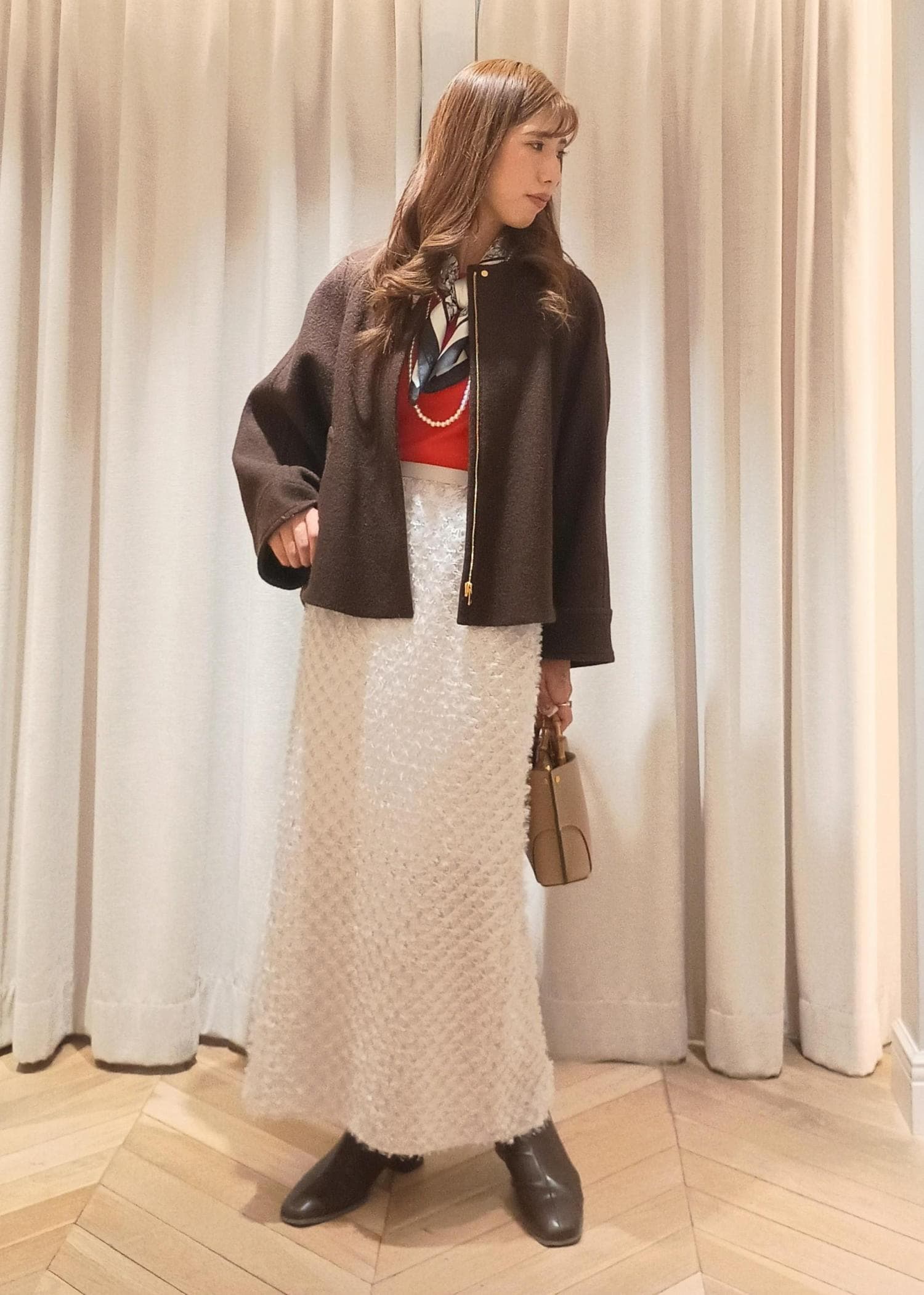 シャツ×デニムのシンプルな組み合わせですが、こなれ感のある着こなしで一気にオシャレ度UP!!シャツはあえてインにすることで上半身がコンパクトに見え脚長効果が引き立ちます!肩がけでカラーニットを合わせることで目線が上にいき、更にスタイルアップ効果がUPします!マニッシュだけど可愛さも忘れずに。シアーやパールがアクセントになっています!