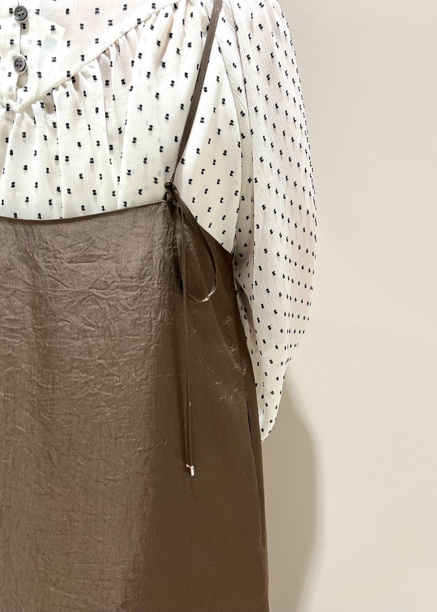 程よい光沢感のあるキャミワンピースにドットブラウスを合わせ、フェミニンなコーディネートにしてみました♪