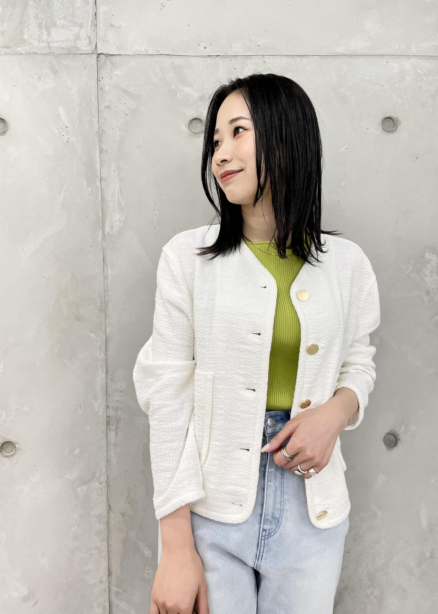 デイリーに着られるように通常のツィードジャケットのコンサバ感を消したモダンな一枚となっております。