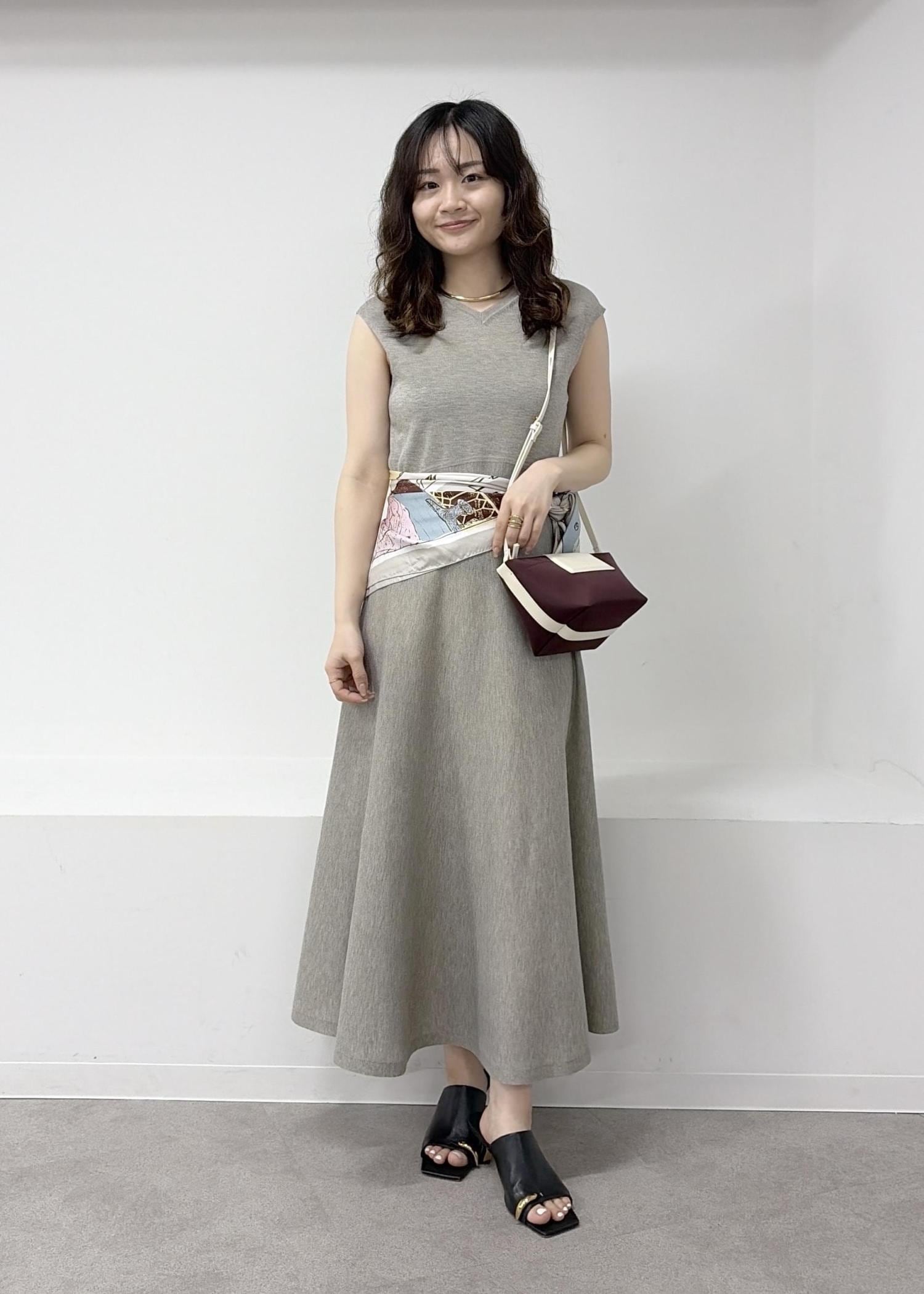 生成りのボトムを合わせコントラストを出しすぎないようにしたのと、ブラウンの小物使いで落ち着きも取り入れています。