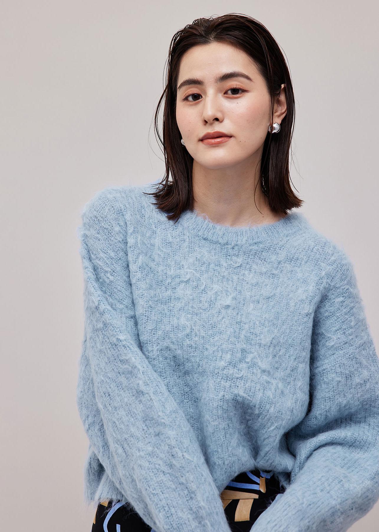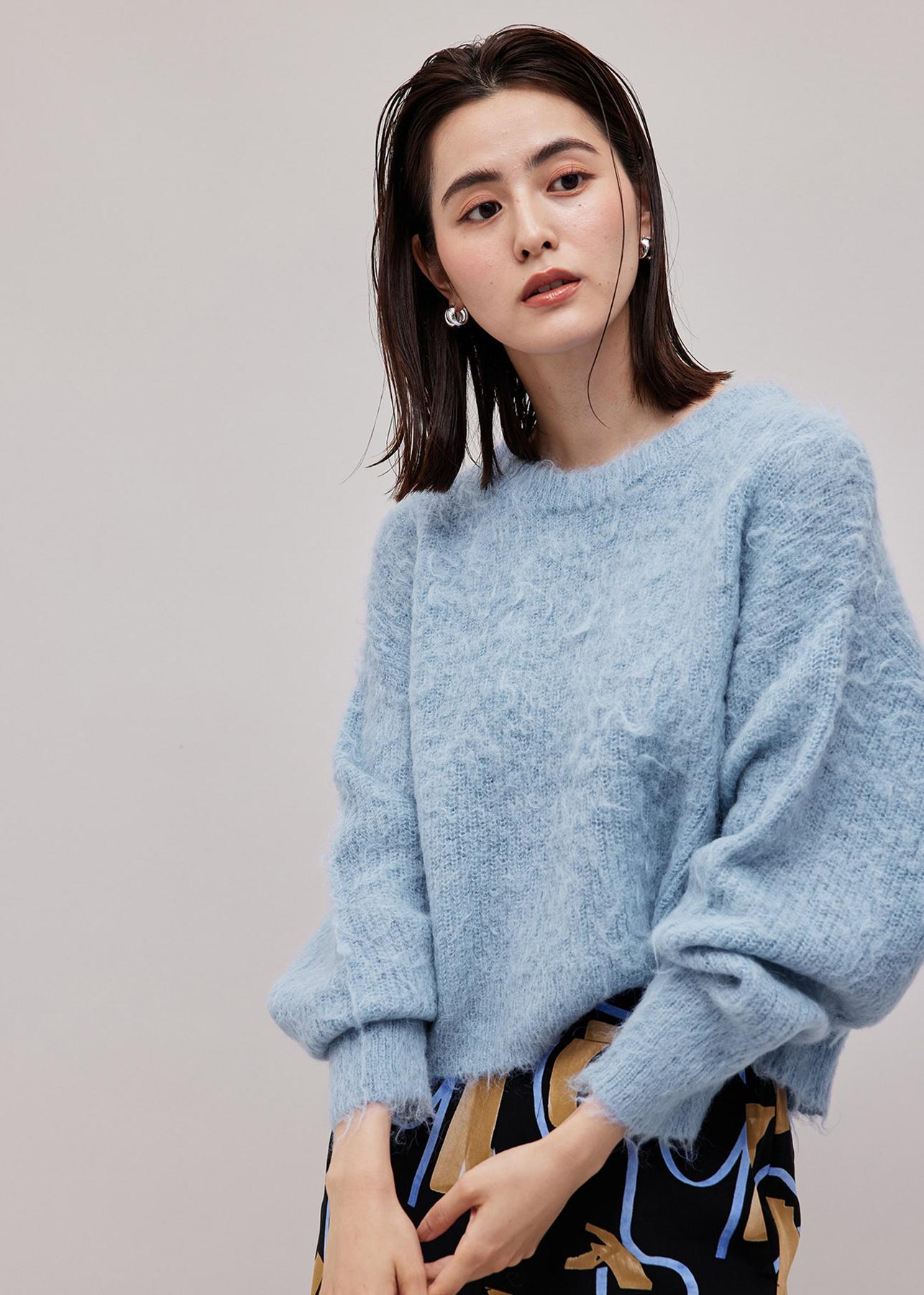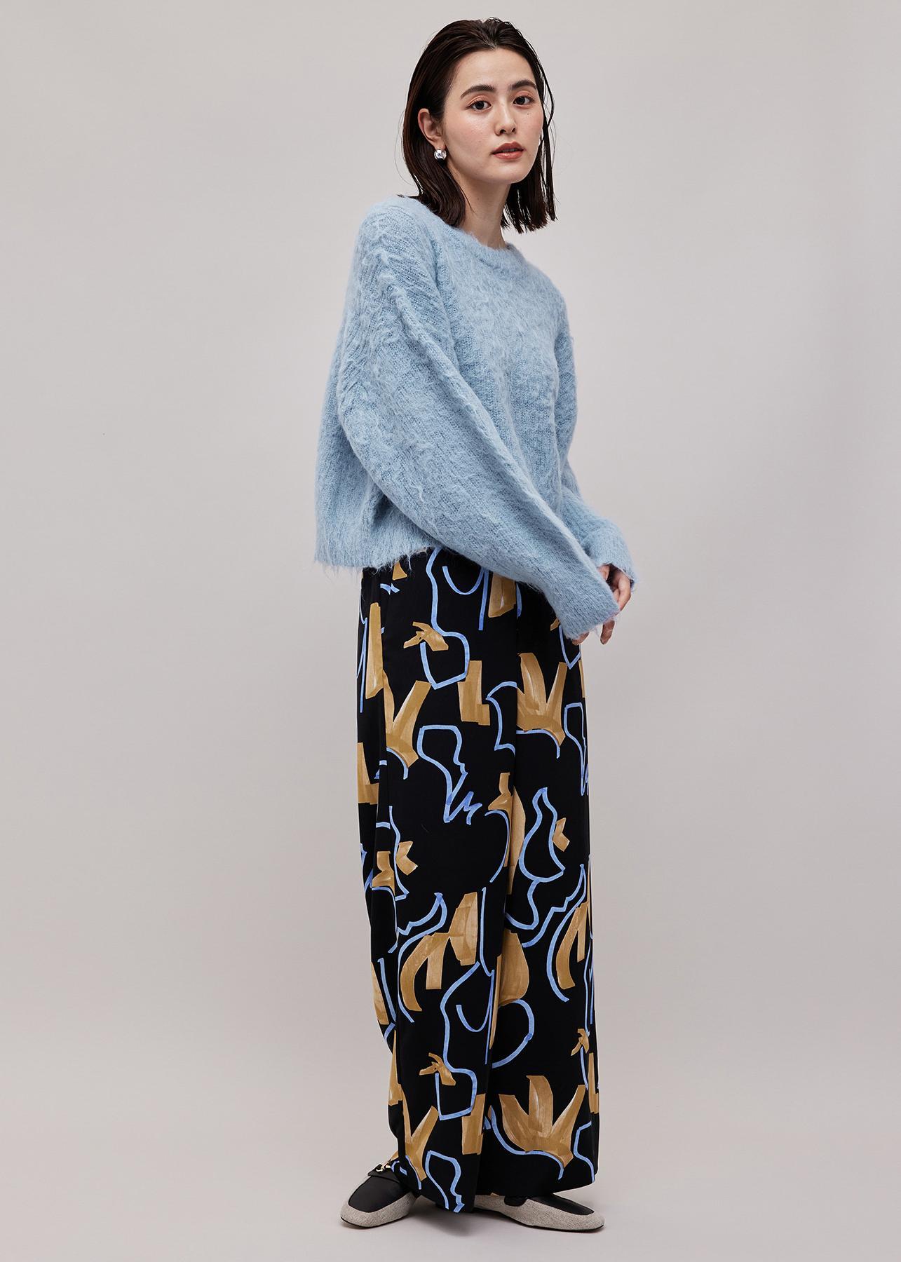 ニットは着丈が長いものが多い中で、ワイドパンツなど太めのボトムは