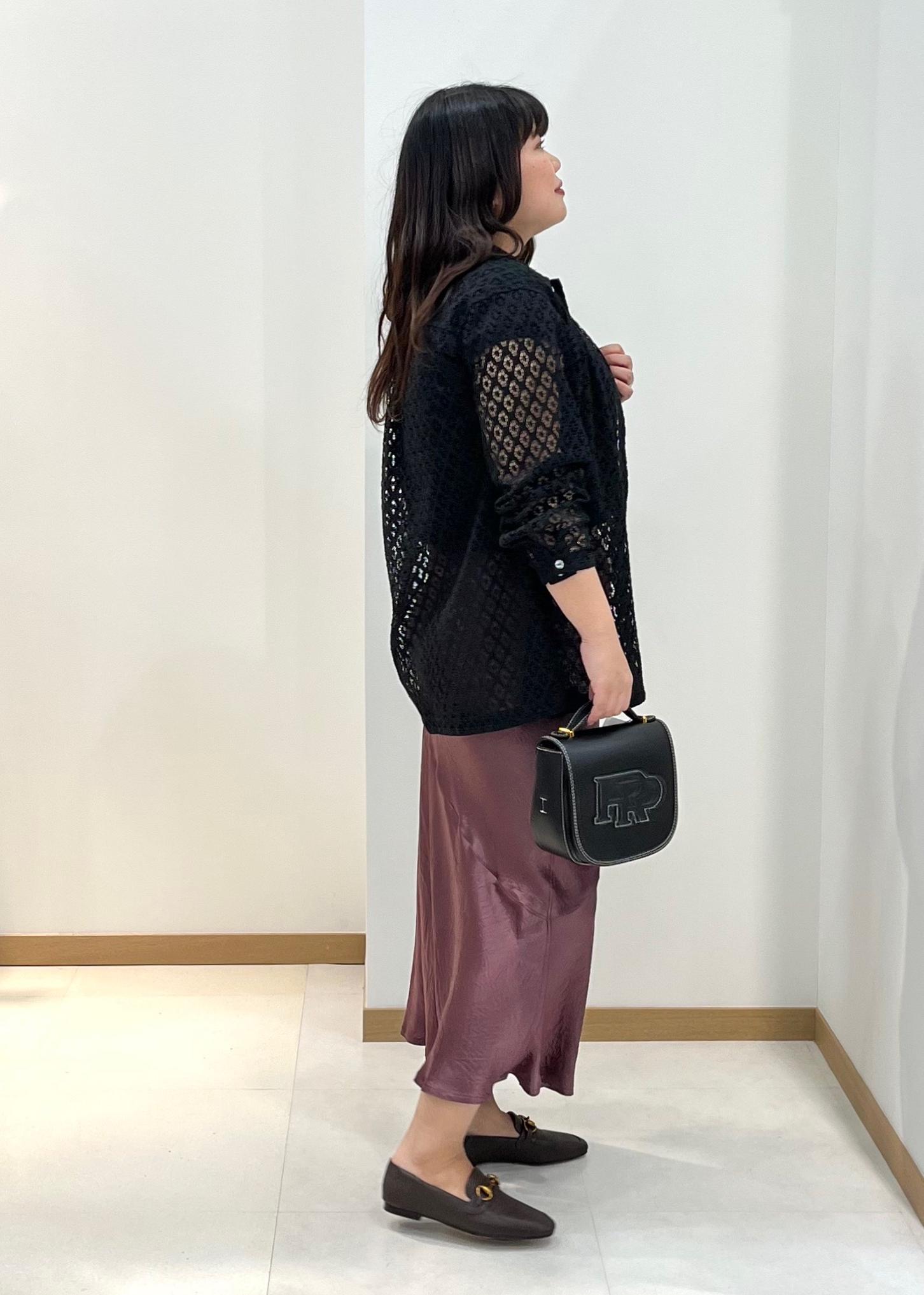トップスは黒であわせているので、首元のゴールドのネックレスが映えます。