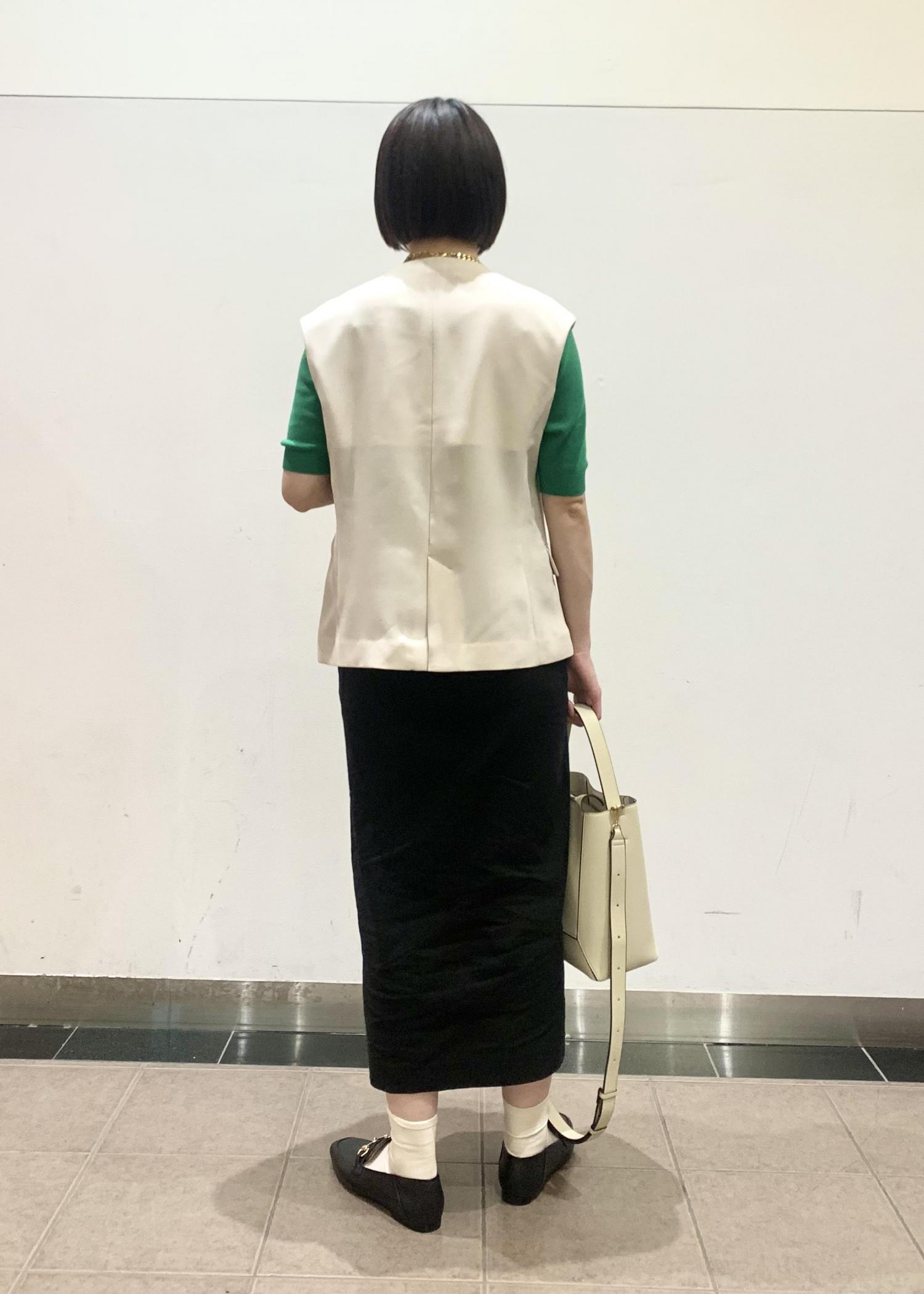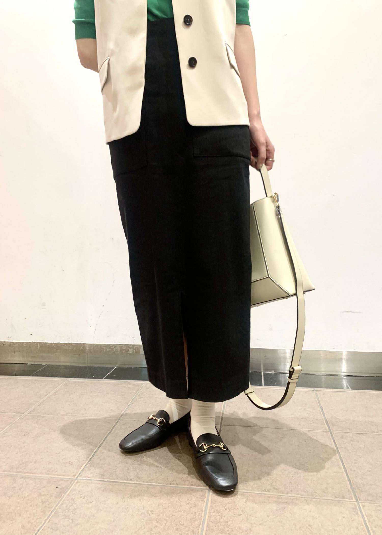 ハイゲージやブラウスで合わせたキレイめスタイリングでお仕事でも使えます。