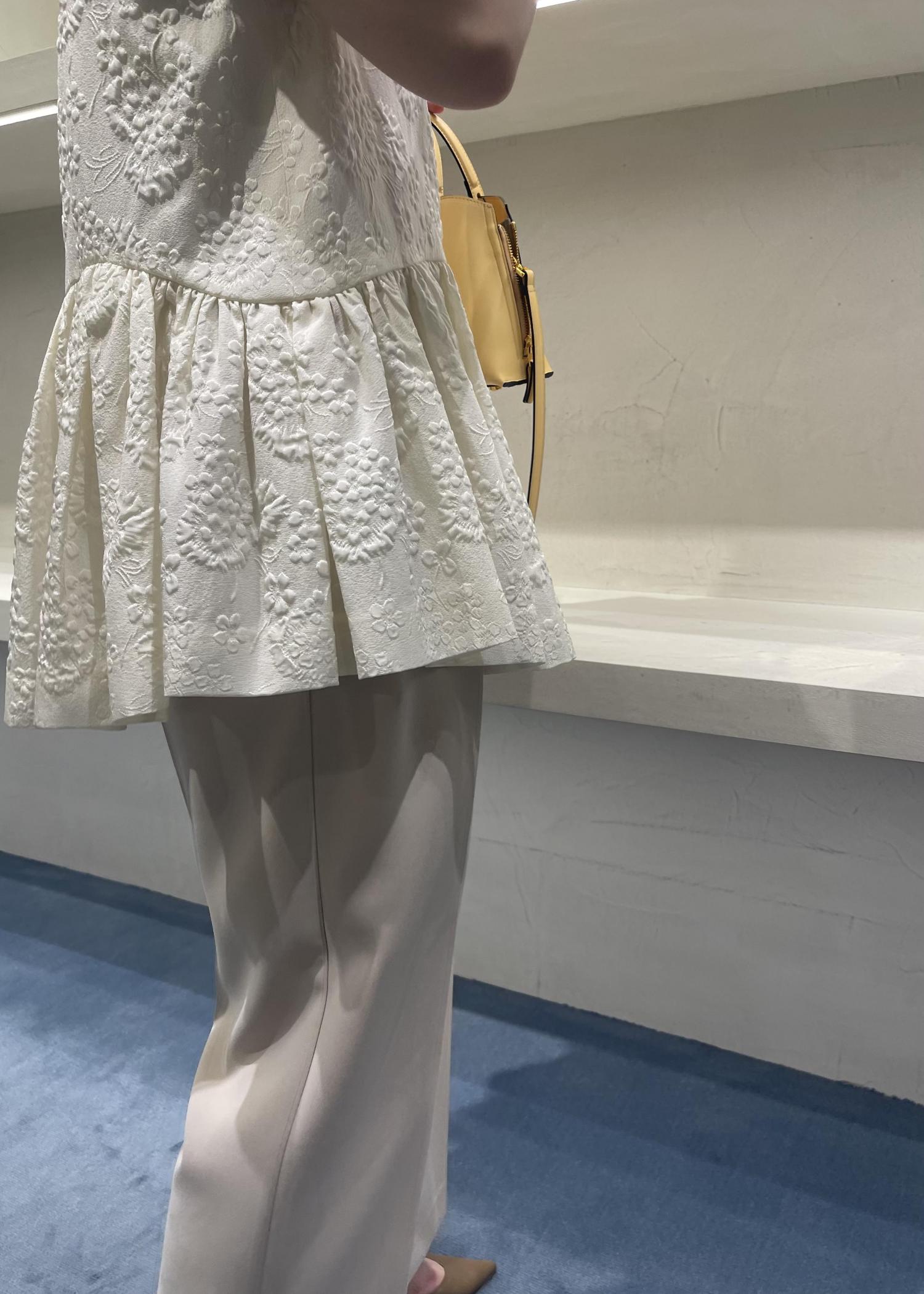 アセテートの素材感とふくれジャガードが上品な1着。