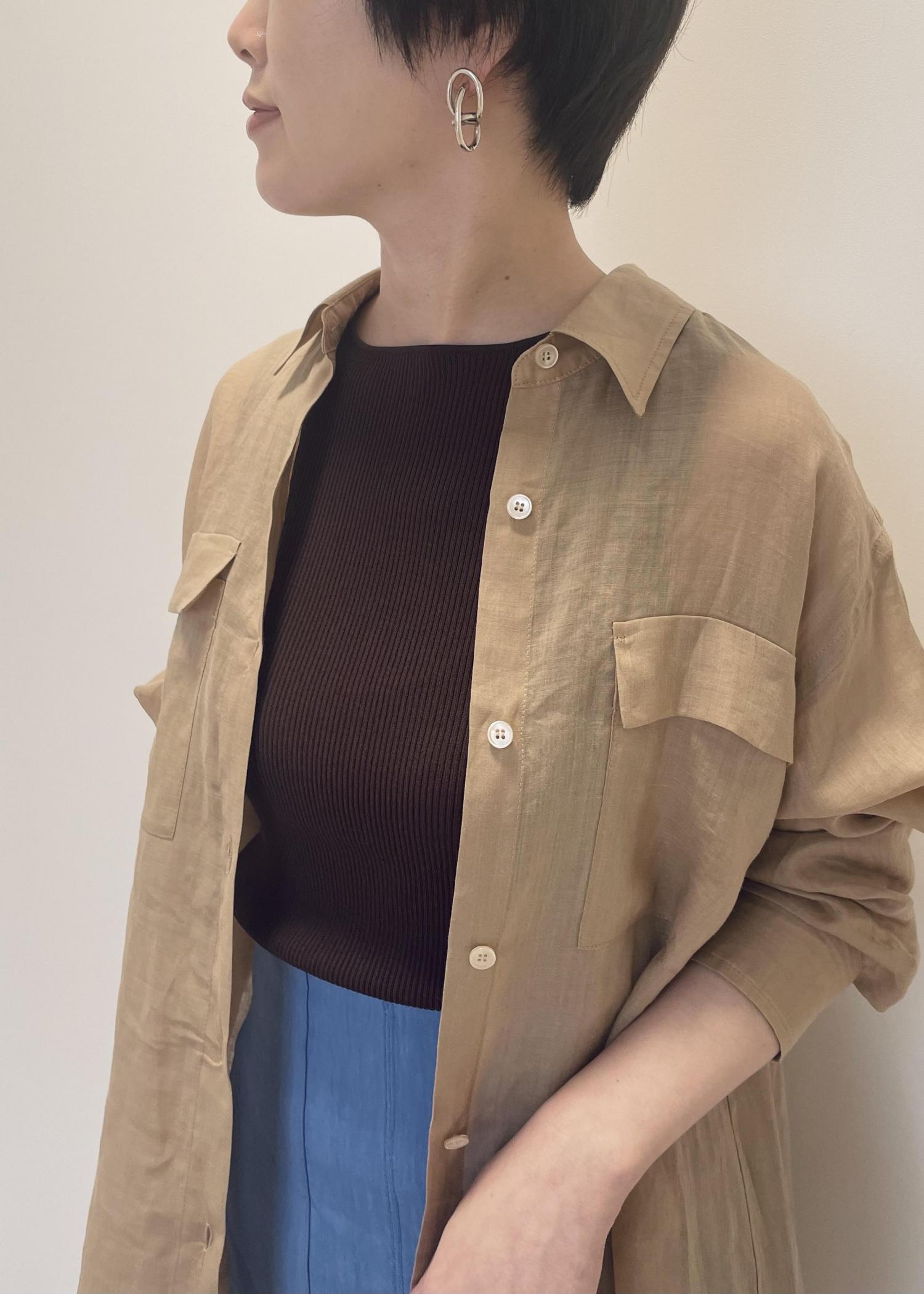 カラーにより素材が異なります。着用している無地のブルーは、レーヨン40%、麻34%、綿23%ポリウレタン3%とさらっとした素材です。