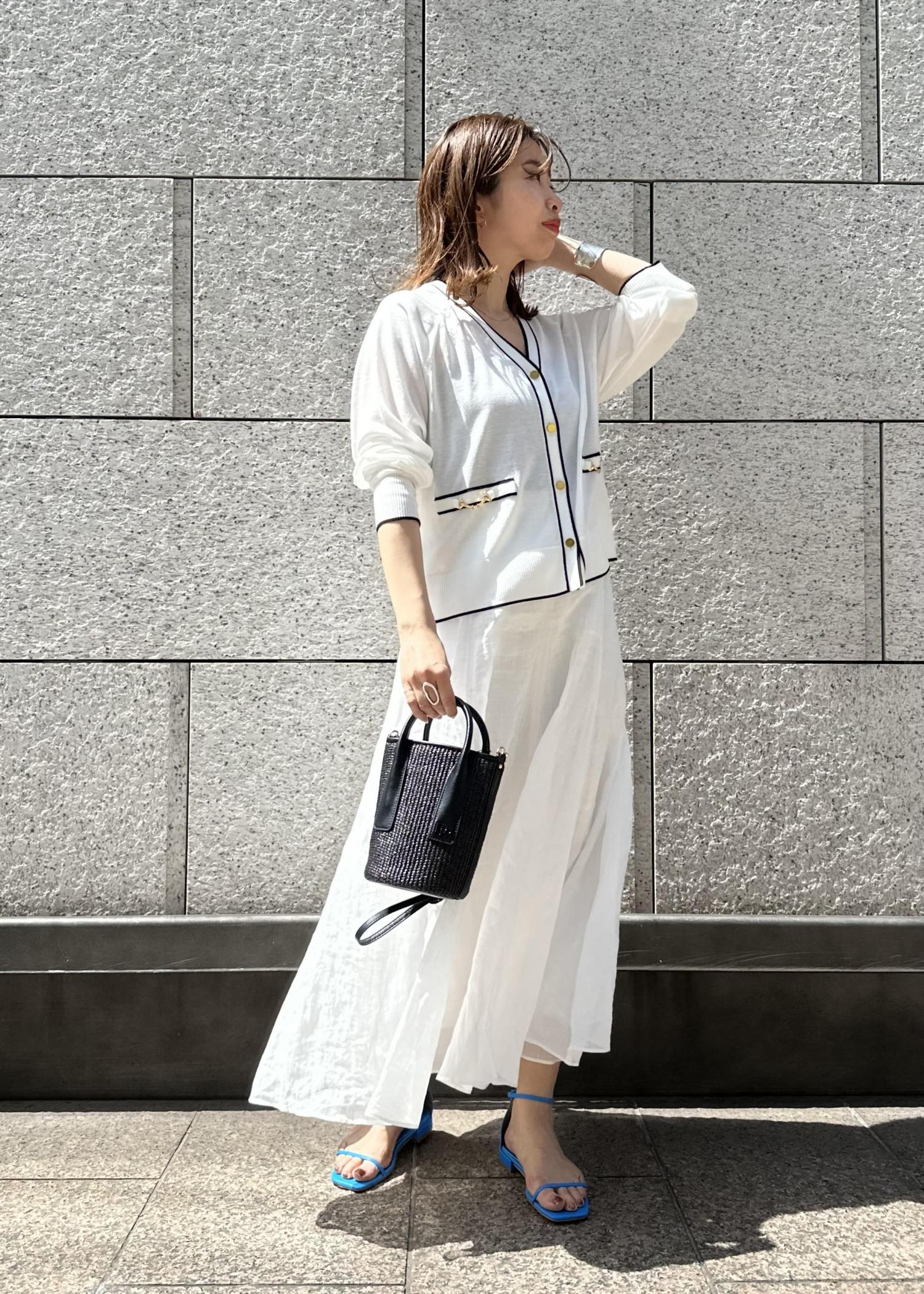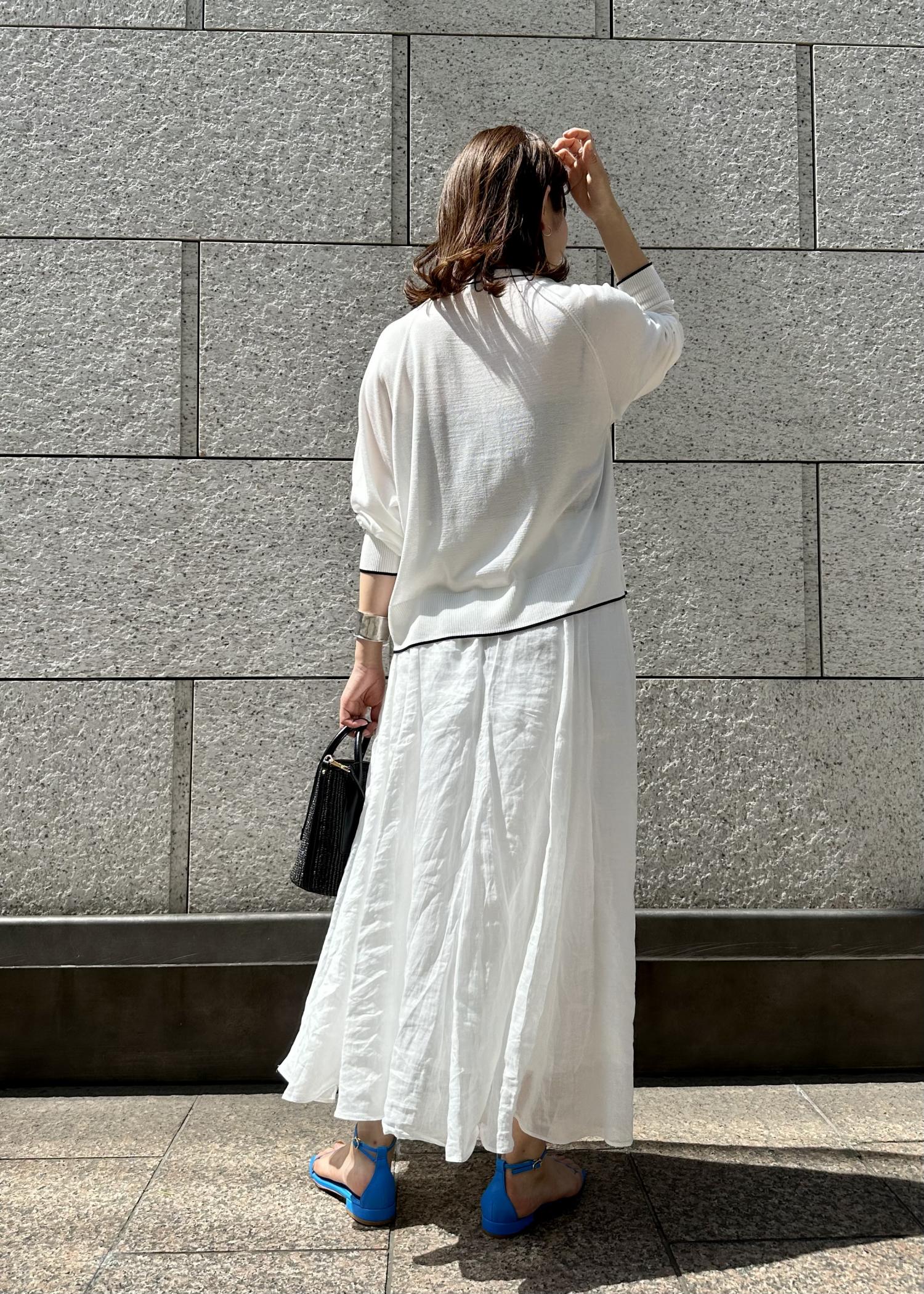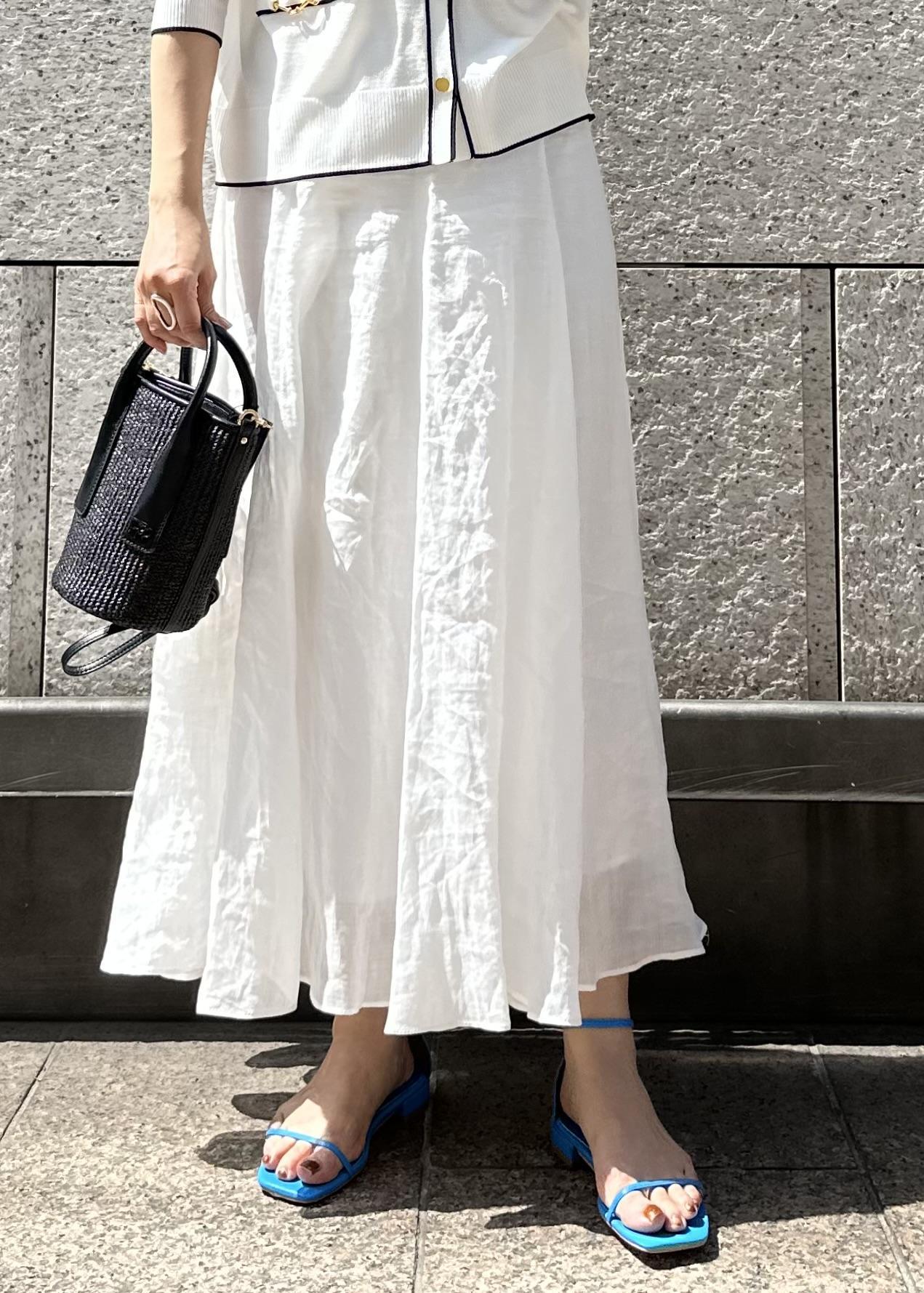 鮮やかなブルーのカラーサンダルをアクセントにしたホワイトコーデ