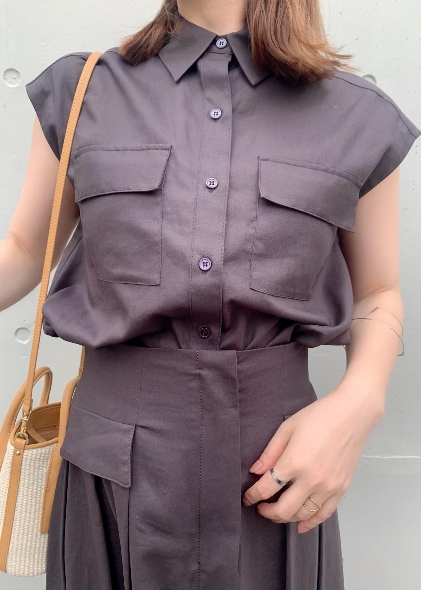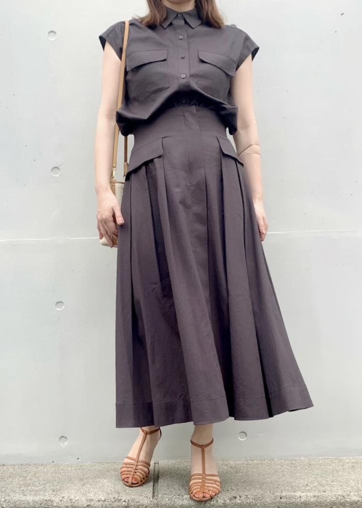 甘さが出やすいスカートスタイルもシャツ型セットアップであざとすぎない清楚スタイルが完成します。