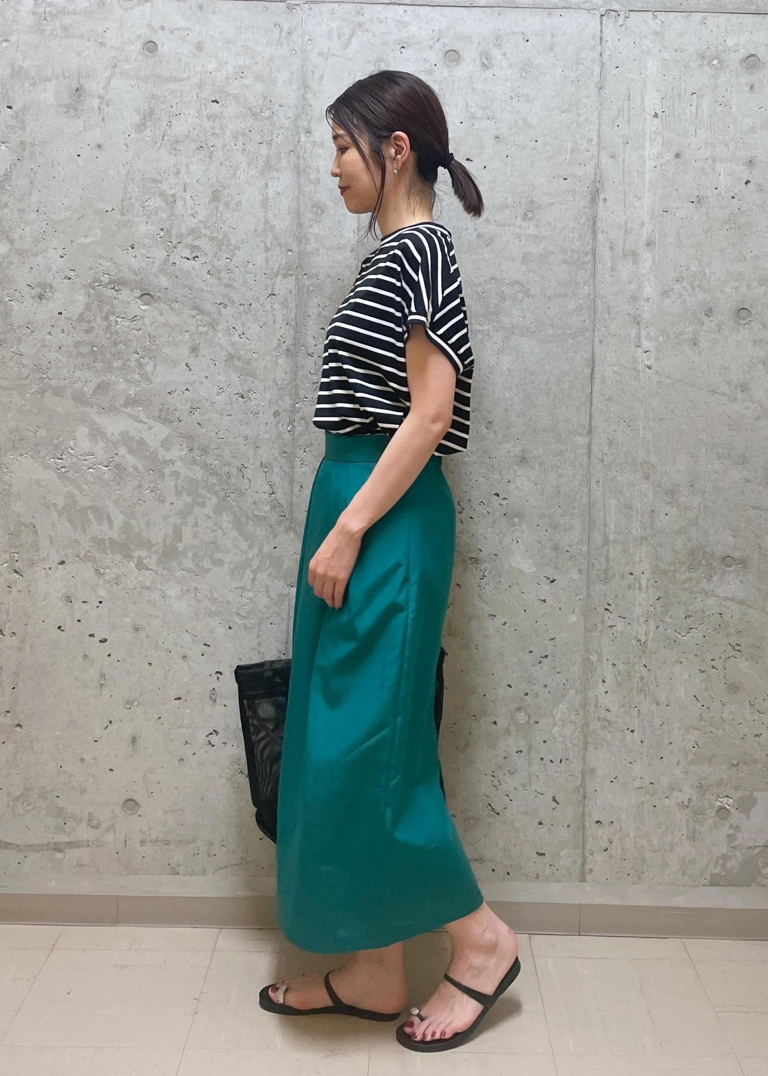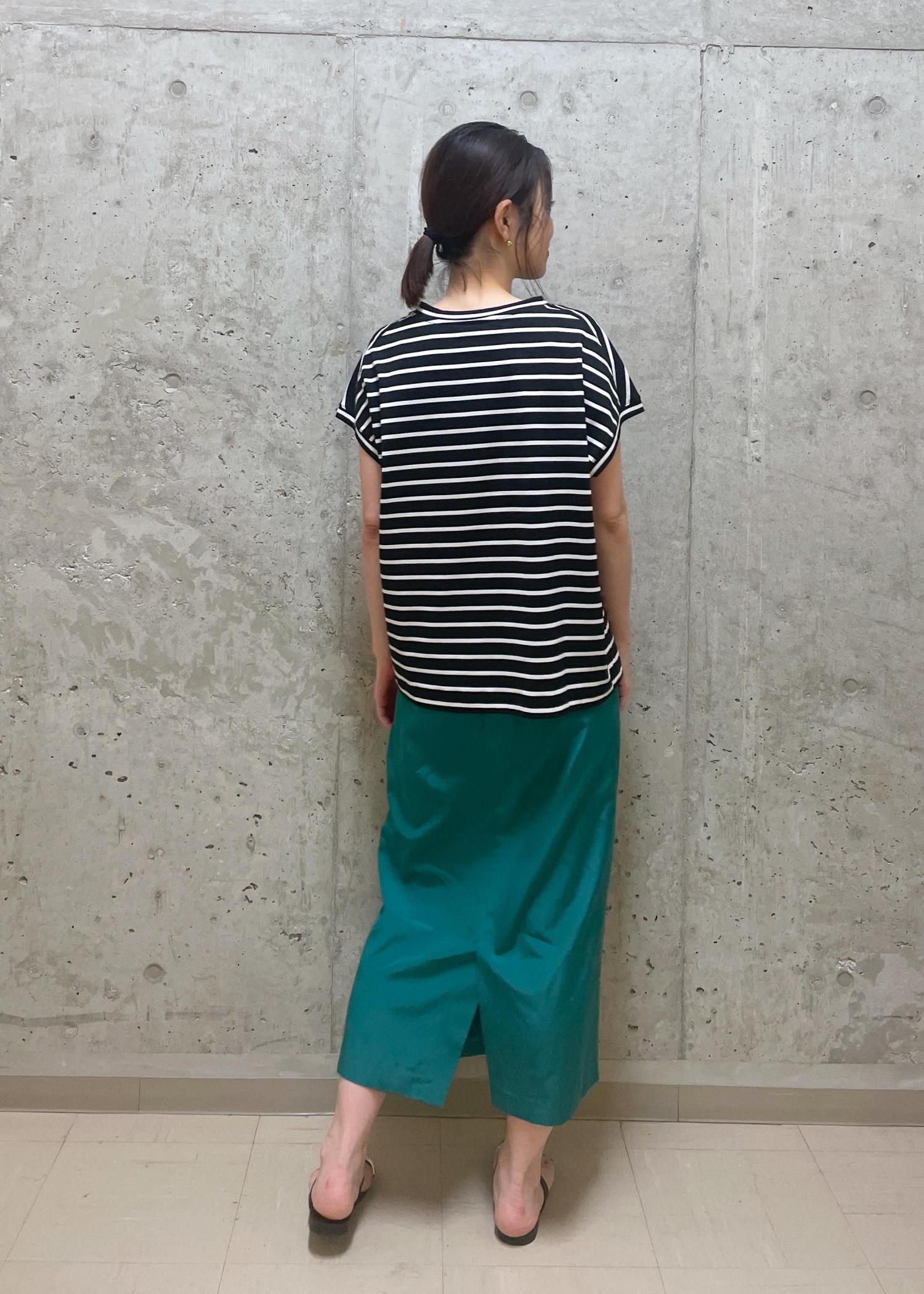 今回はボーダー×グリーンでカラーをポイントにしたカジュアルなスタイリングにしました。