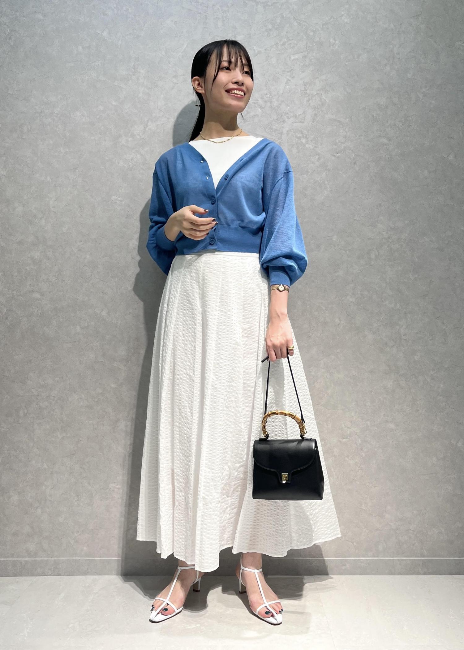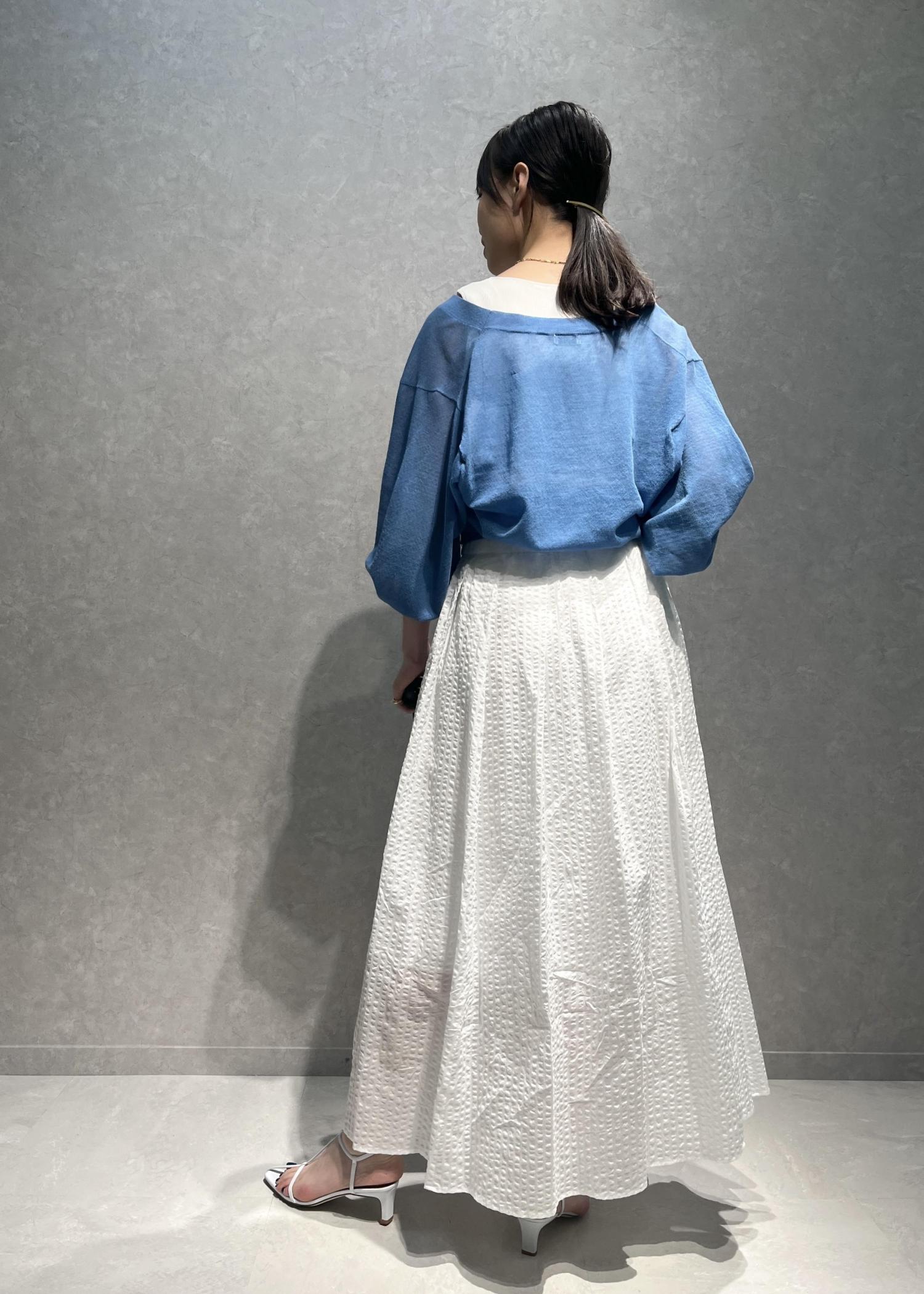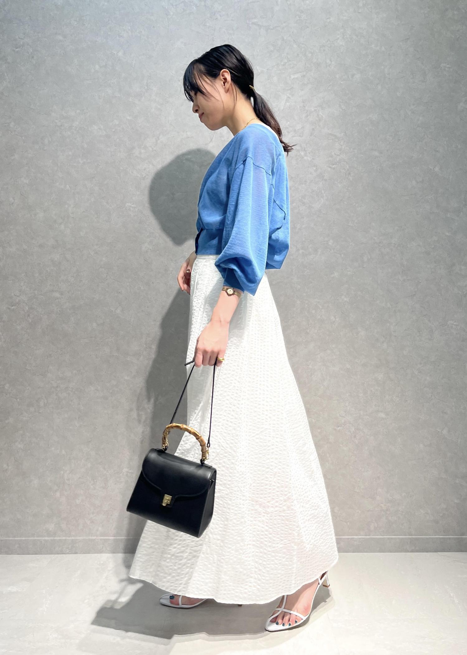 綿の風合いが涼しげで、ぽこぽことした凹凸感の表情がある素材なので、ドライタッチでカジュアルにも着回しやすいです!