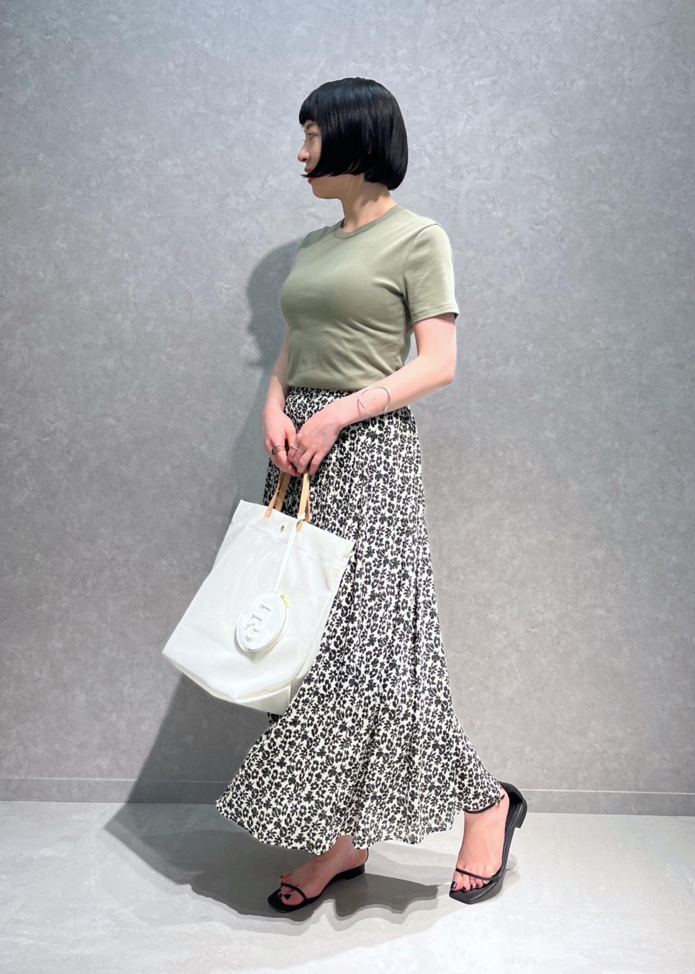 Deveauxの花柄スカートにコンパクトなTシャツを合わせて、シンプルですがラインがきれいなコーディネートにしました♪