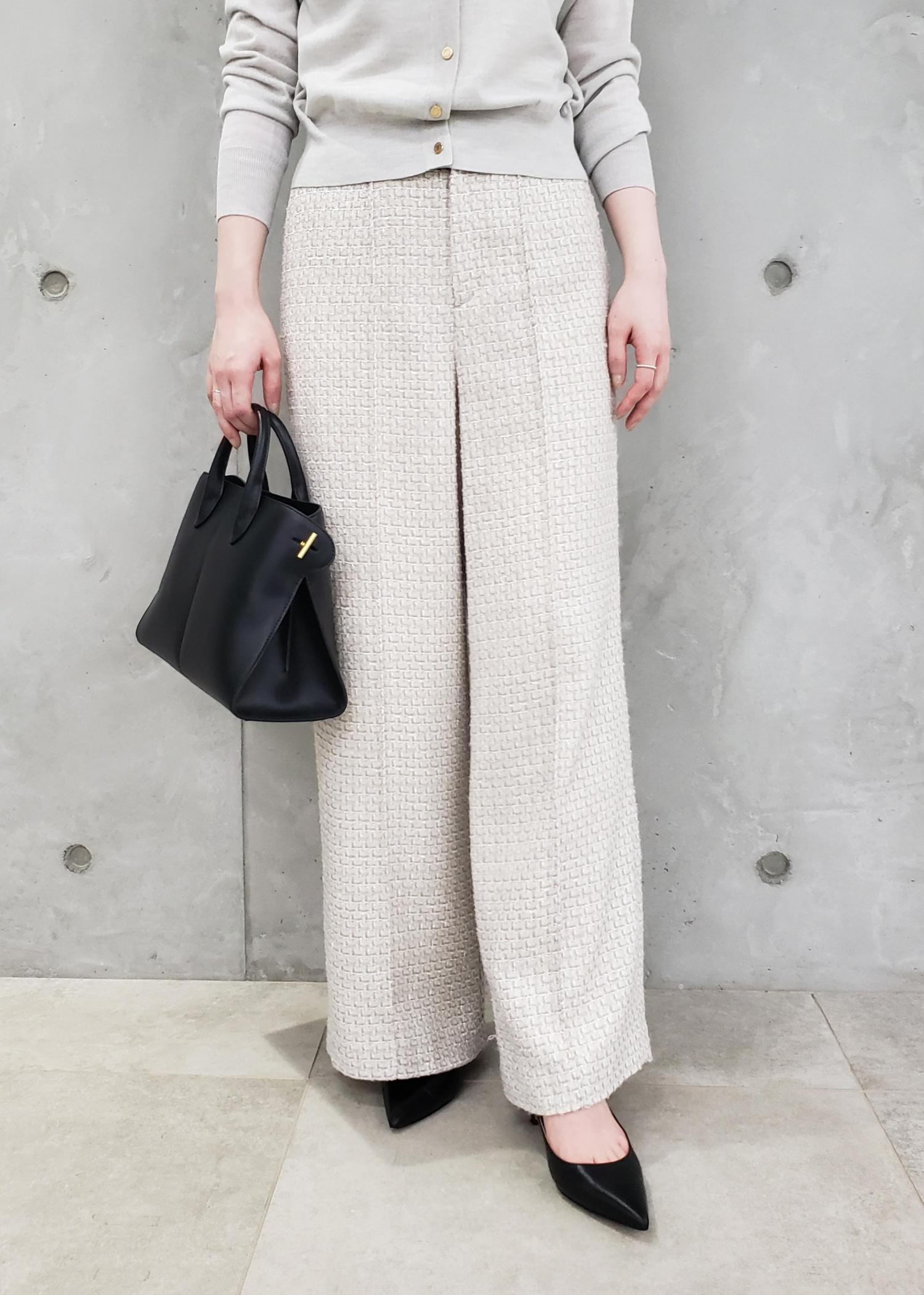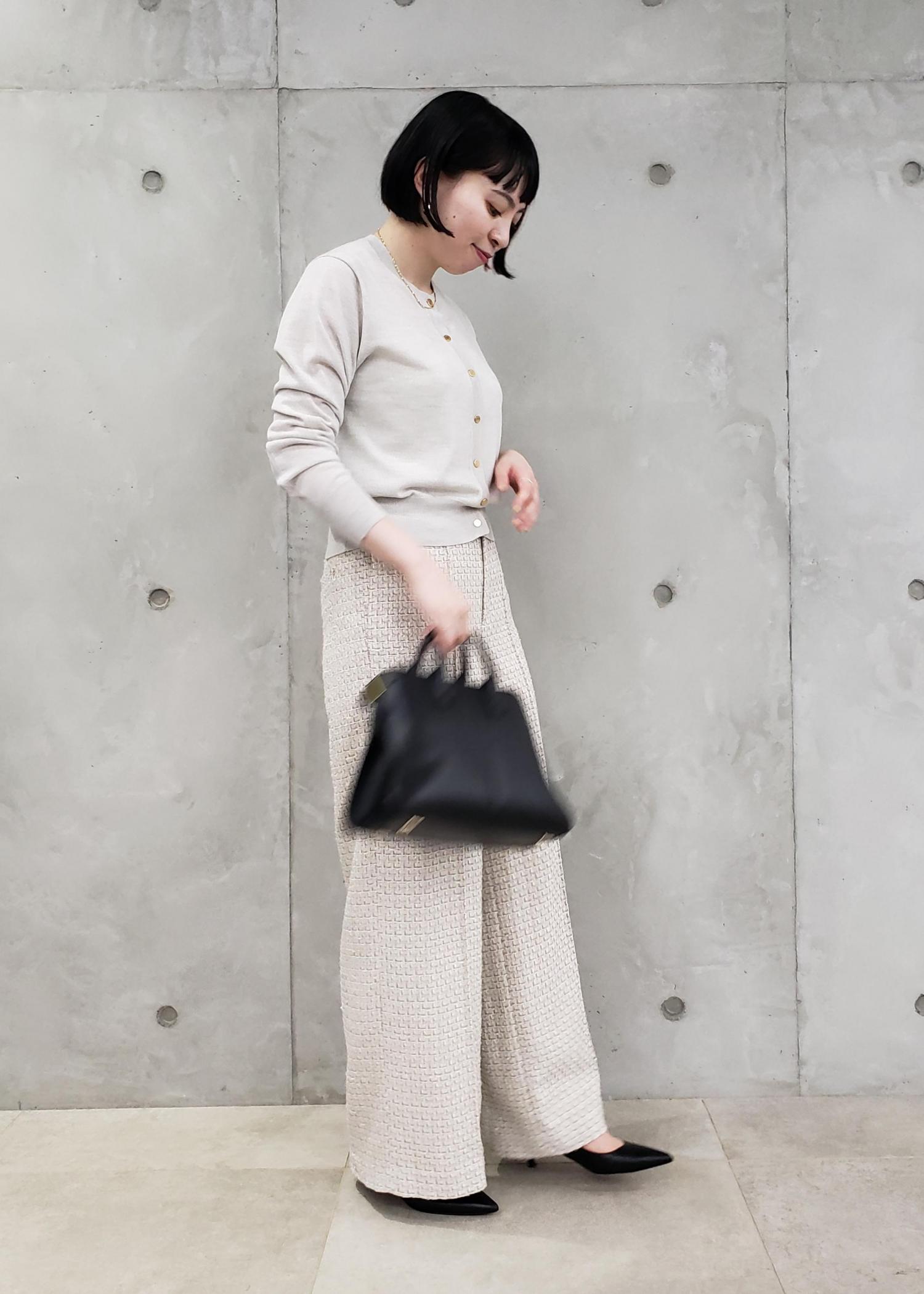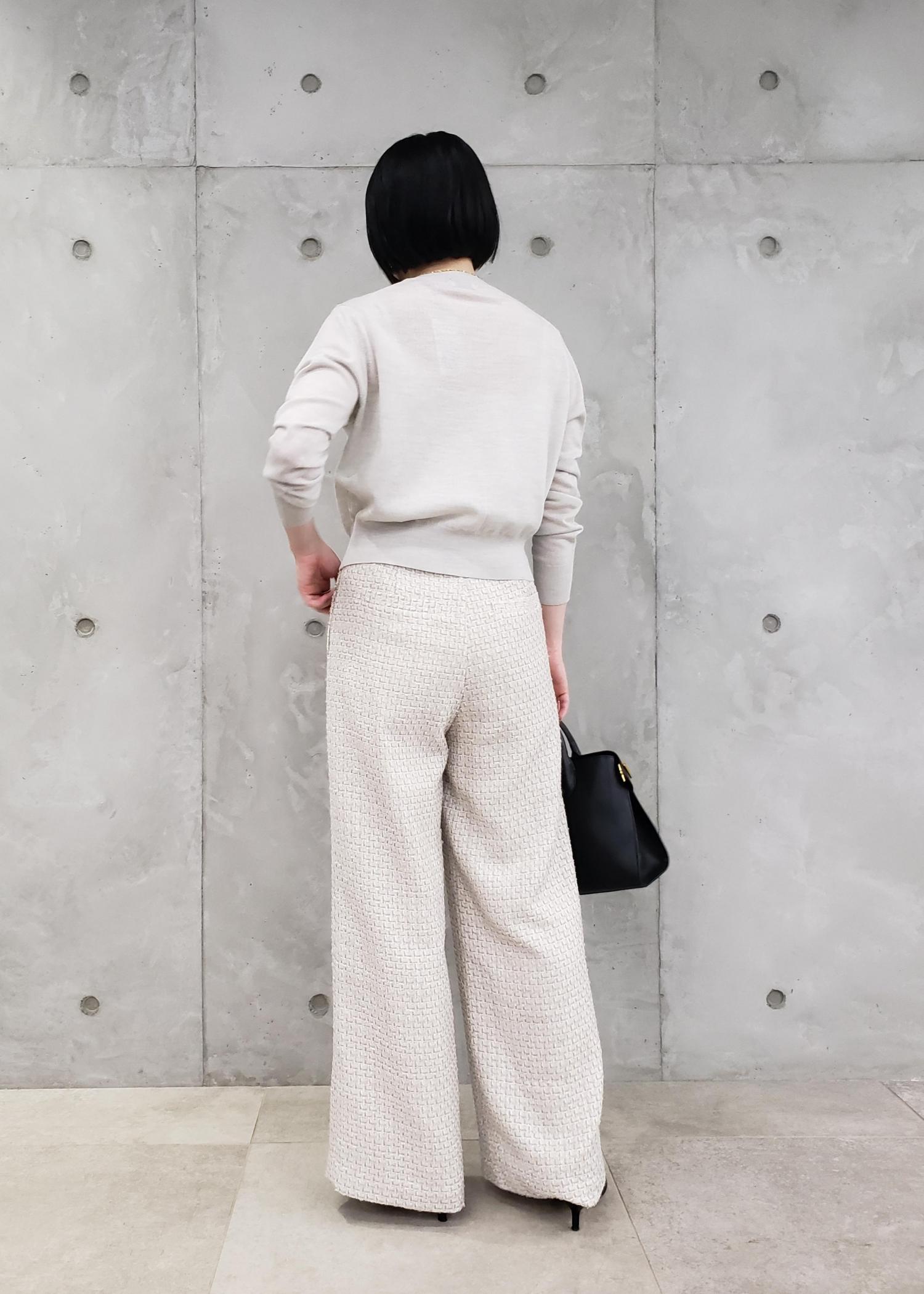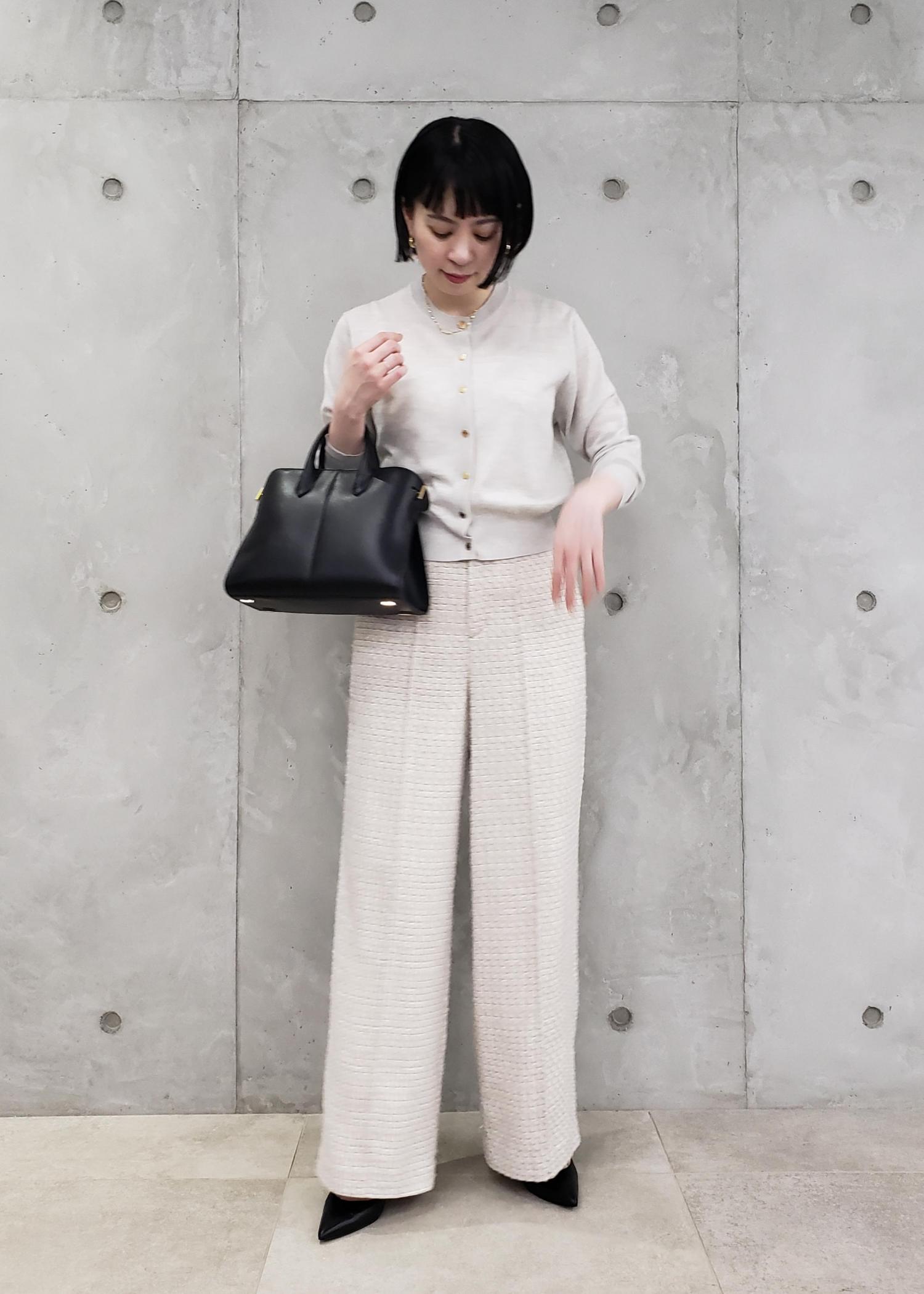 ワントーンだからこそウールの柔らかさやパンツのツイードの素材感が引き立つコーディネートです。