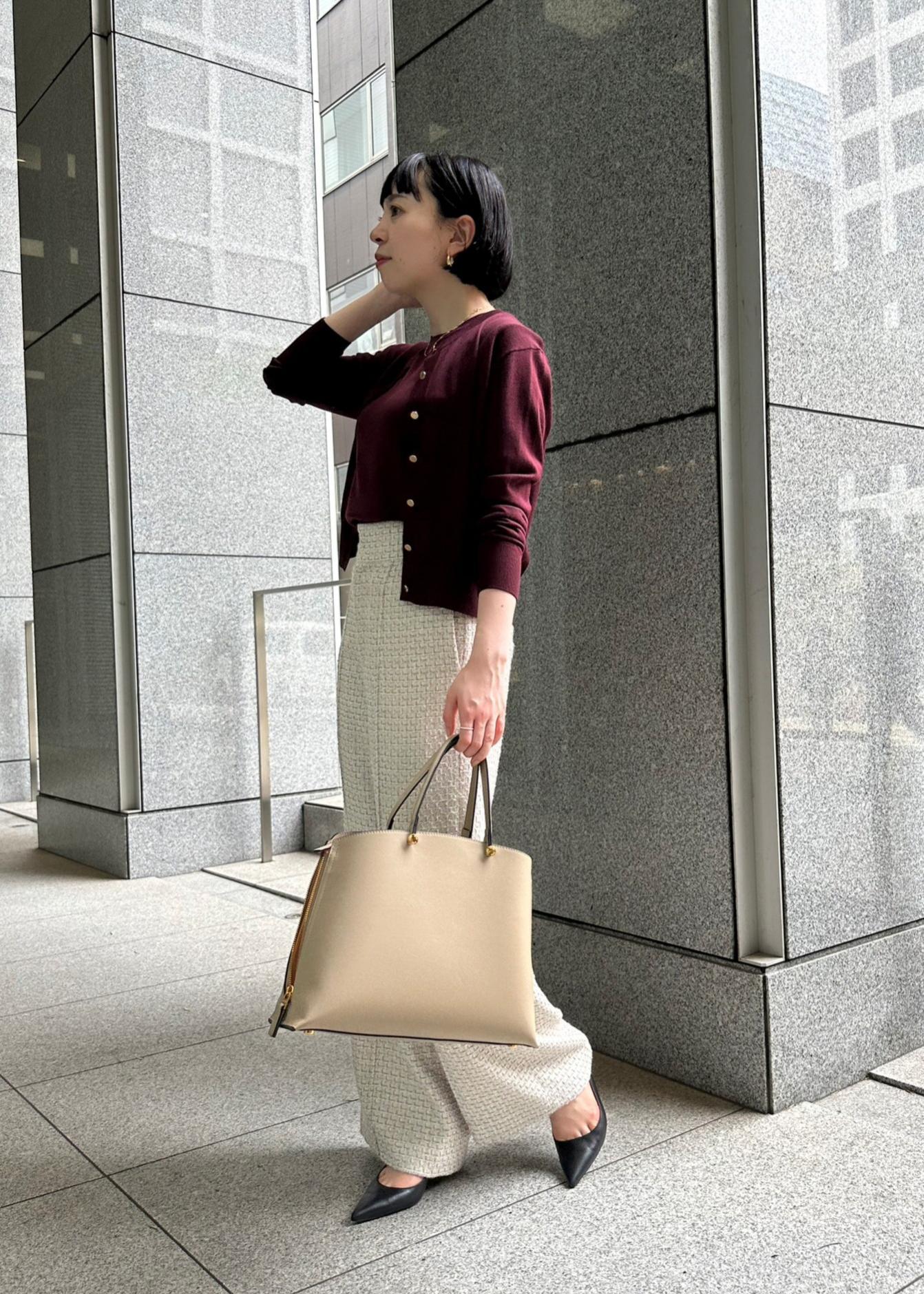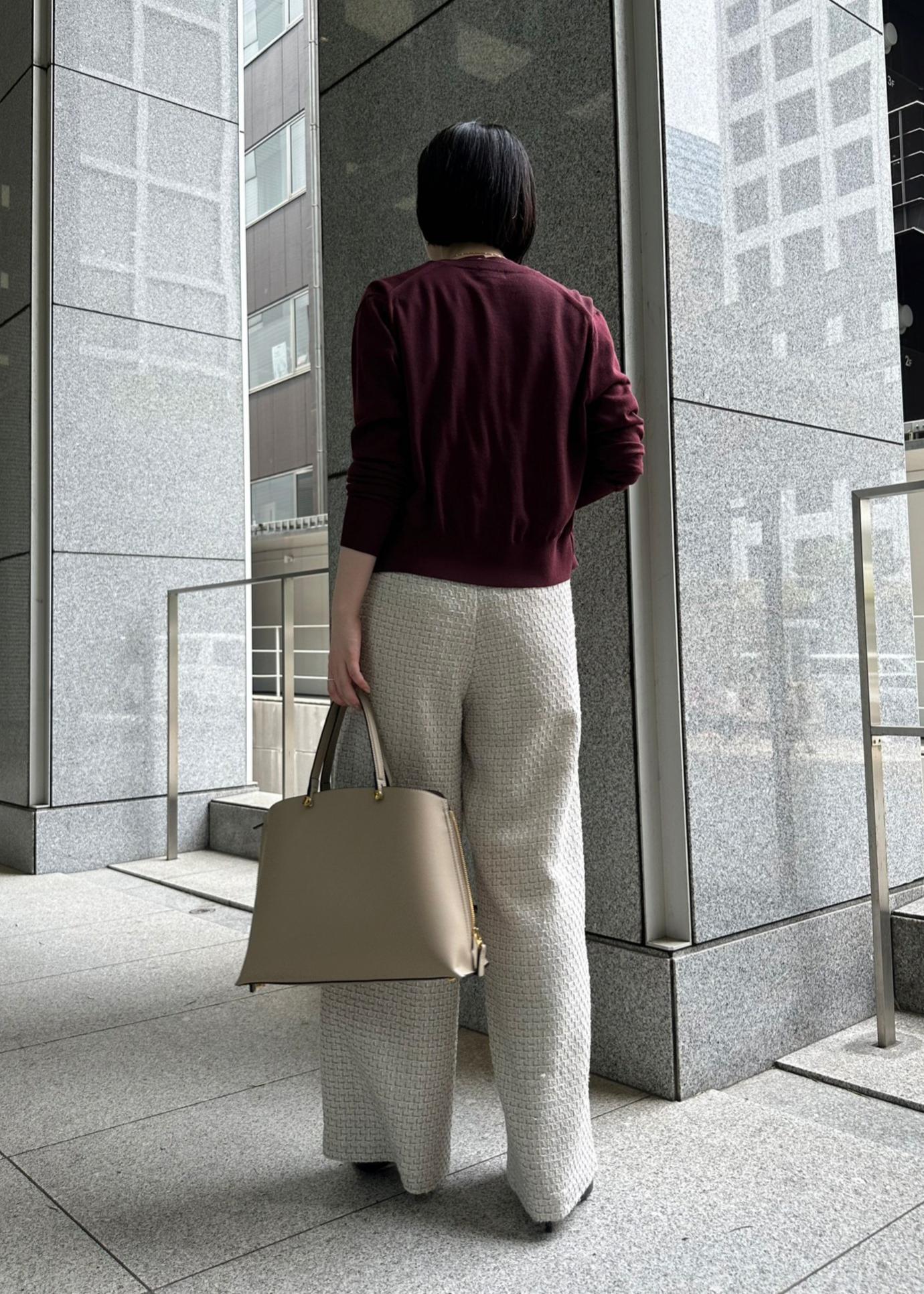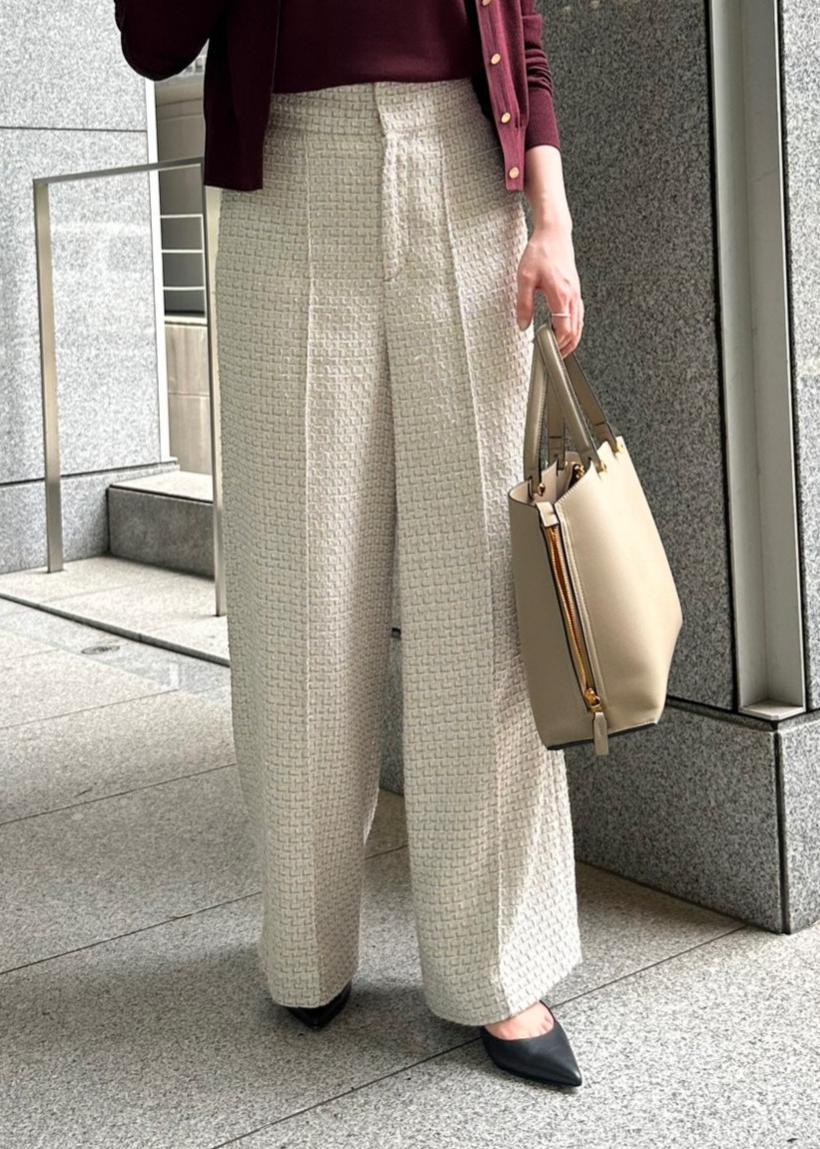 ツイードデザインのパンツを合わせて秋らしい通勤スタイルをイメージしました。